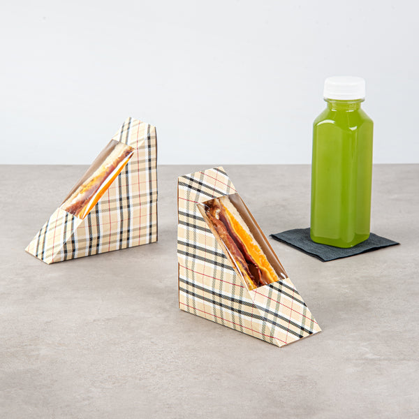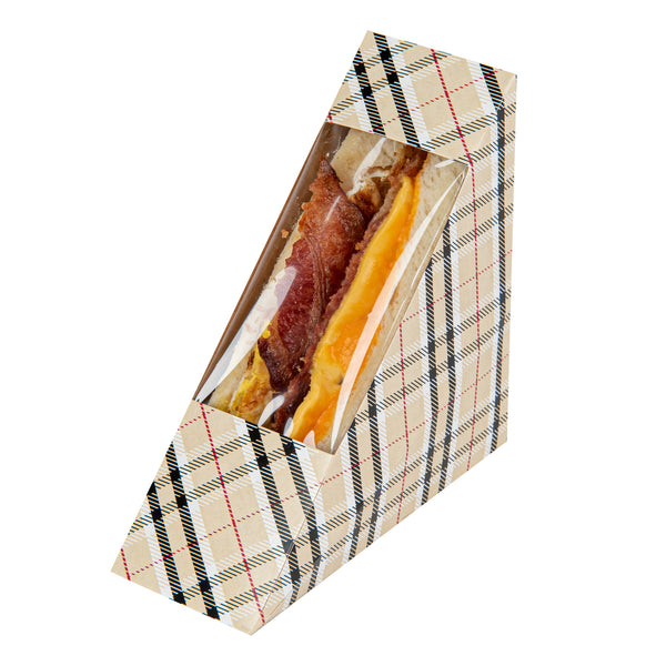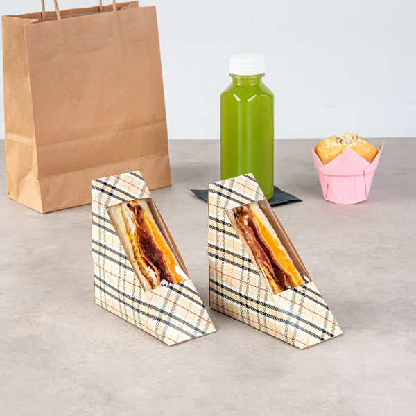 Offer a stylish way to transport sandwiches with our Cafe Vision Triangle Plaid Paper Small Sandwich Boxes. The triangular design of these paper sandwich containers allows for easy stacking and space-efficient storage. Made from high-quality grease-resistant paper, these sandwich containers are durable and prevent leaky messes. A small transparent window on these paper sandwich boxes showcases your signature sandwiches while keeping them securely contained. Easily fitting half-cut sandwiches, these efficient sandwich packaging boxes are ideal for quick deliveries. These premium paper sandwich boxes safely come in contact with food. Lightweight and disposable, these sandwich boxes with a window reduce hassle. Measuring 4.75 inches in length by 4.75 inches in width by 2 inches in height, these compact sandwich containers conserve space. Sold in a 200 count box.