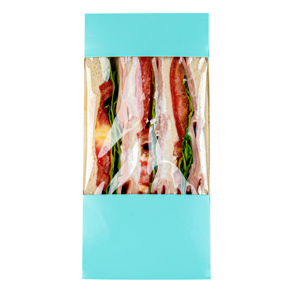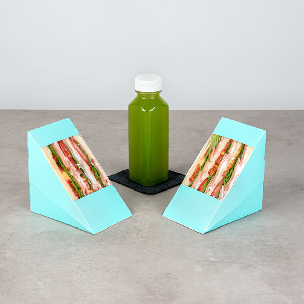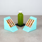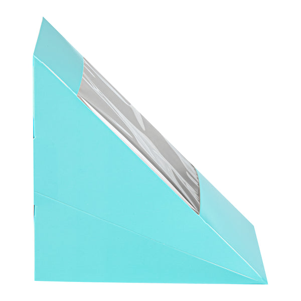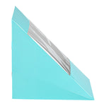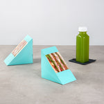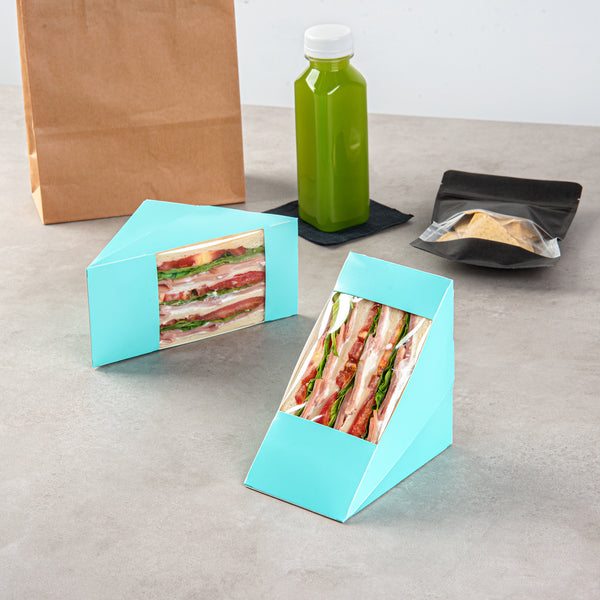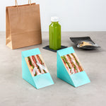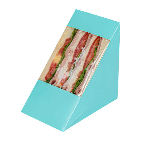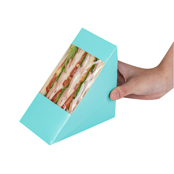 Offer an efficient way to deliver sandwiches Cafe Vision Triangle Turquoise Paper Large Sandwich Boxes. The triangular design of these premium sandwich wedges allows for easy stacking and organizing, saving valuable space. Constructed from high-quality paper material, these sandwich boxes are durable enough to handle the rigors during deliveries. A small transparent window of these grease-resistant sandwich boxes showcases your sandwiches while keeping them securely contained. Easily fitting multiple half-cut sandwiches, these disposable sandwich takeaway boxes are ideal for catering events or quick-service restaurants. Conveniently disposable, these durable sandwich containers make transporting large orders effortless. Featuring a trendy turquoise finish, these stylish sandwich boxes give your delivery packages an upscale appearance. Measuring 4.75 inches in length by 4.75 inches in width by 3.25 inches in height, these triangular sandwich boxes compactly contain sandwiches while remaining easy to carry. Sold in a 25 count box.