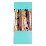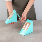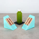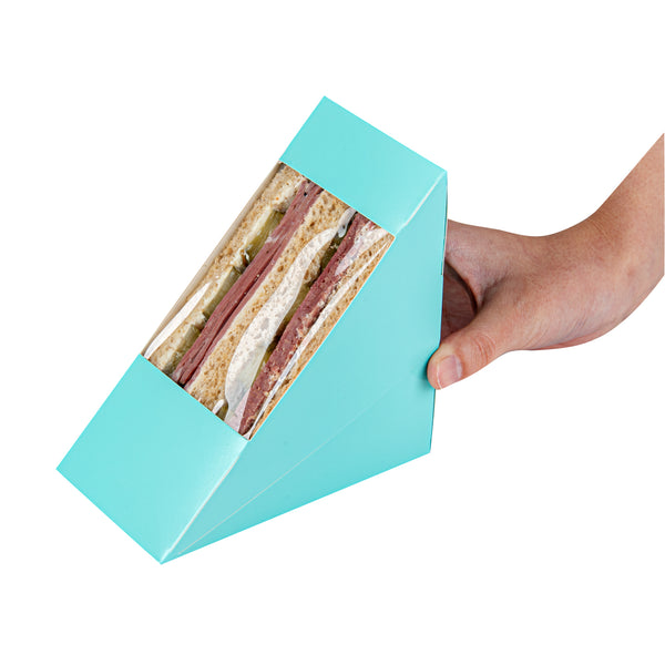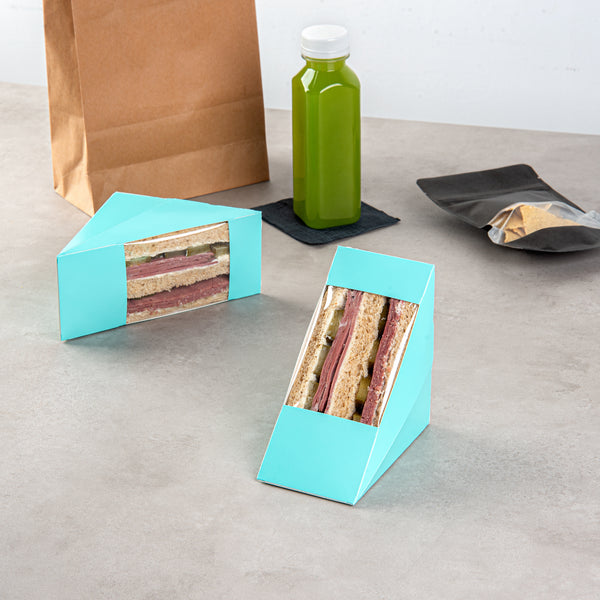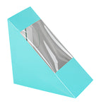Cafe Vision Triangle Turquoise Paper Medium Sandwich Boxes provide premium packaging for sandwiches. The triangular design allows for efficient storage and transport. Constructed from high-quality paper material, these sandwich boxes keep contents fresh. A small transparent window showcases your delectable sandwiches while maintaining food safety. Easily fitting half-cut sandwiches, these disposable sandwich containers are ideal for deliveries. Lightweight yet durable, these sandwich packaging boxes handle deliveries with ease. These turquoise sandwich boxes give a sleek profile while providing a secure grip. Measuring 4.75 inches in length by 4.75 inches in width by 2.75 inches in height, these paper sandwich boxes compactly contain your sandwiches. Sold in a 25 count box.