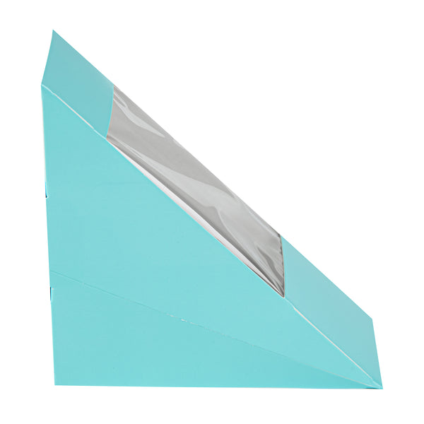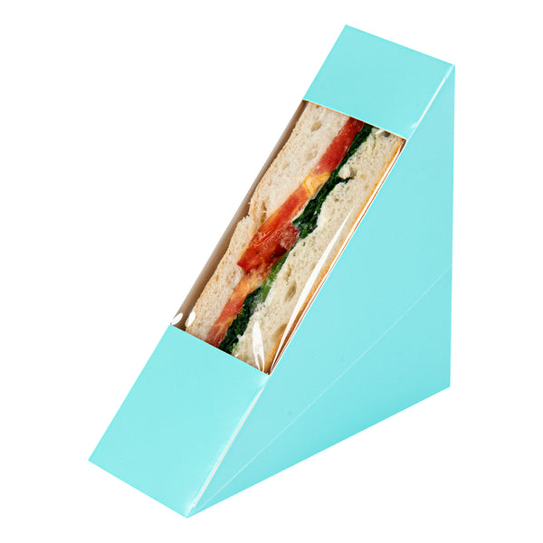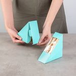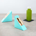 Provide a stylish way to package half sandwiches with our Cafe Vision Triangle Turquoise Paper Small Sandwich Boxes. The triangular design of these sandwich boxes allows for efficient use of space during transport and storage. Constructed of high-quality paper material, these premium sandwich boxes are disposable yet durable enough to securely contain ingredients. A small transparent window of these grease-resistant sandwich boxes showcases the sandwich inside to tempt customers. Easily fitting half-cut sandwiches, these disposable sandwich boxes are ideal for catering deliveries and grab-and-go meals. Disposable and lightweight, these paper sandwich containers reduce cleanup. Measuring 4.75 inches in length by 4.75 inches in width by 2 inches in height, these compact sandwich boxes conserve space in any kitchen. Sold in a 200 count box.