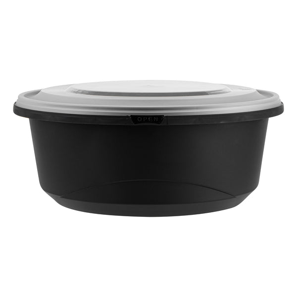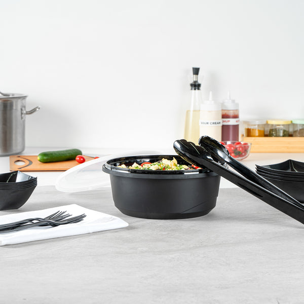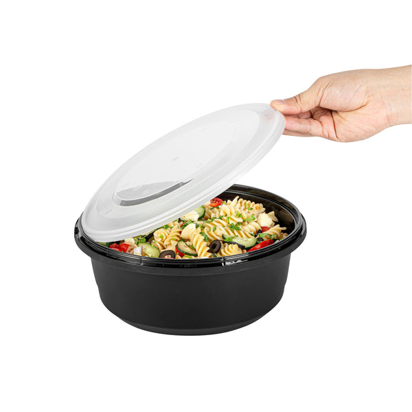 Elevate your catering experience with our Cater Tek 101-ounce Round Black Plastic Catering / Serving Bowls. These serving bowls come with clear lids that form a snug fit and help maintain freshness while enhancing the convenience of storage and transport. Microwave-safe, these plastic bowls can withstand temperatures up to 248F, ensuring versatility for various dishes. Plus, these large serving bowls are freezer-safe, making them perfect for storing leftovers. Crafted from premium plastic, these serving dishes are ideal for holding both hot and cold food items. For an easy cleanup, these disposable bowls can be discarded after use. These plastic bowls with lids boast a generous capacity of 101 ounces and measure 9.65 inches in diameter by 4.02 inches in height. Sold in a 100 count box.