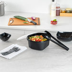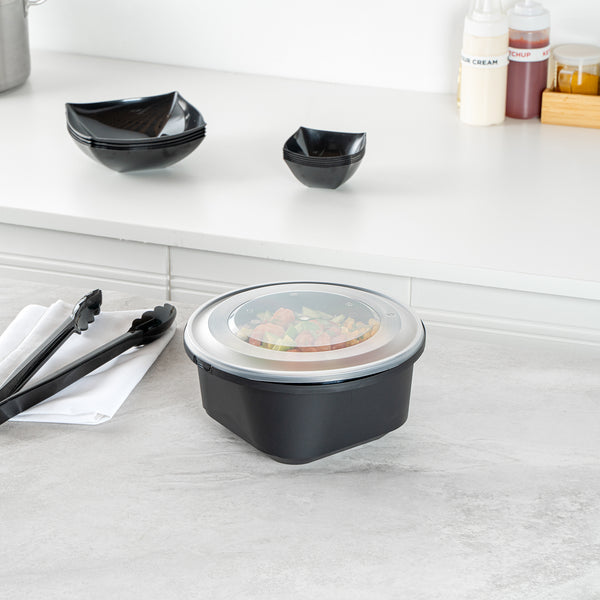 Enhance your food presentation with our Cater Tek 118-ounce Round Black Plastic Catering / Serving Bowls. These serving bowls come with clear lids that form a snug fit to maintain freshness and enhance storage and transport convenience. Ideal for holding hot and cold food items, these serving dishes are microwavable and can withstand temperatures up to 248F. These plastic bowls with lids are also freezable, making them perfect for storing leftovers. Crafted from premium plastic, these disposable bowls with lids are disposable, ensuring a straightforward cleanup process. With a generous capacity of 118 ounces, these plastic bowls measures 9.65 inches in diameter by 4.72 inches in height. Sold in a 100 count box.