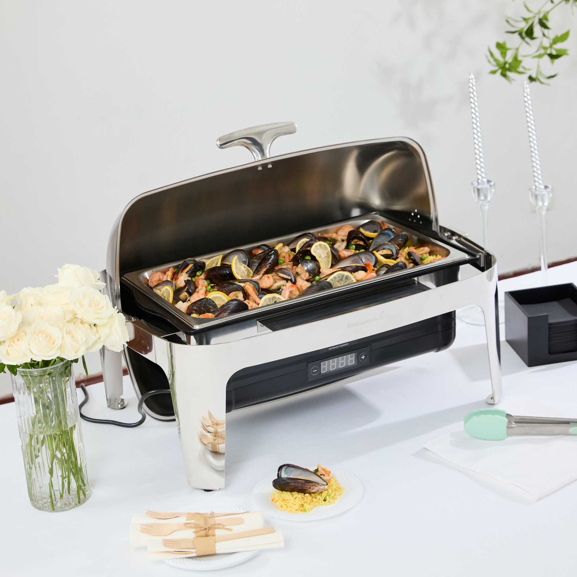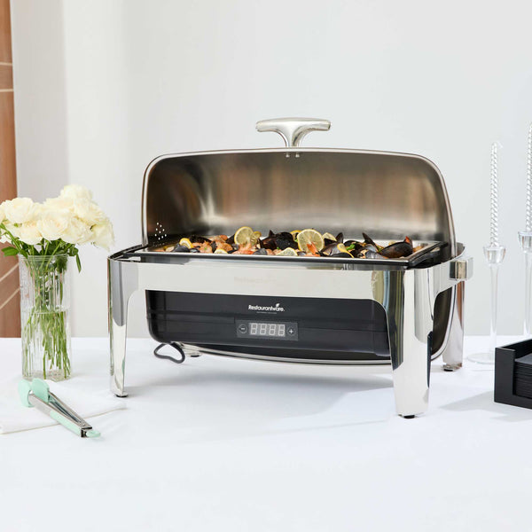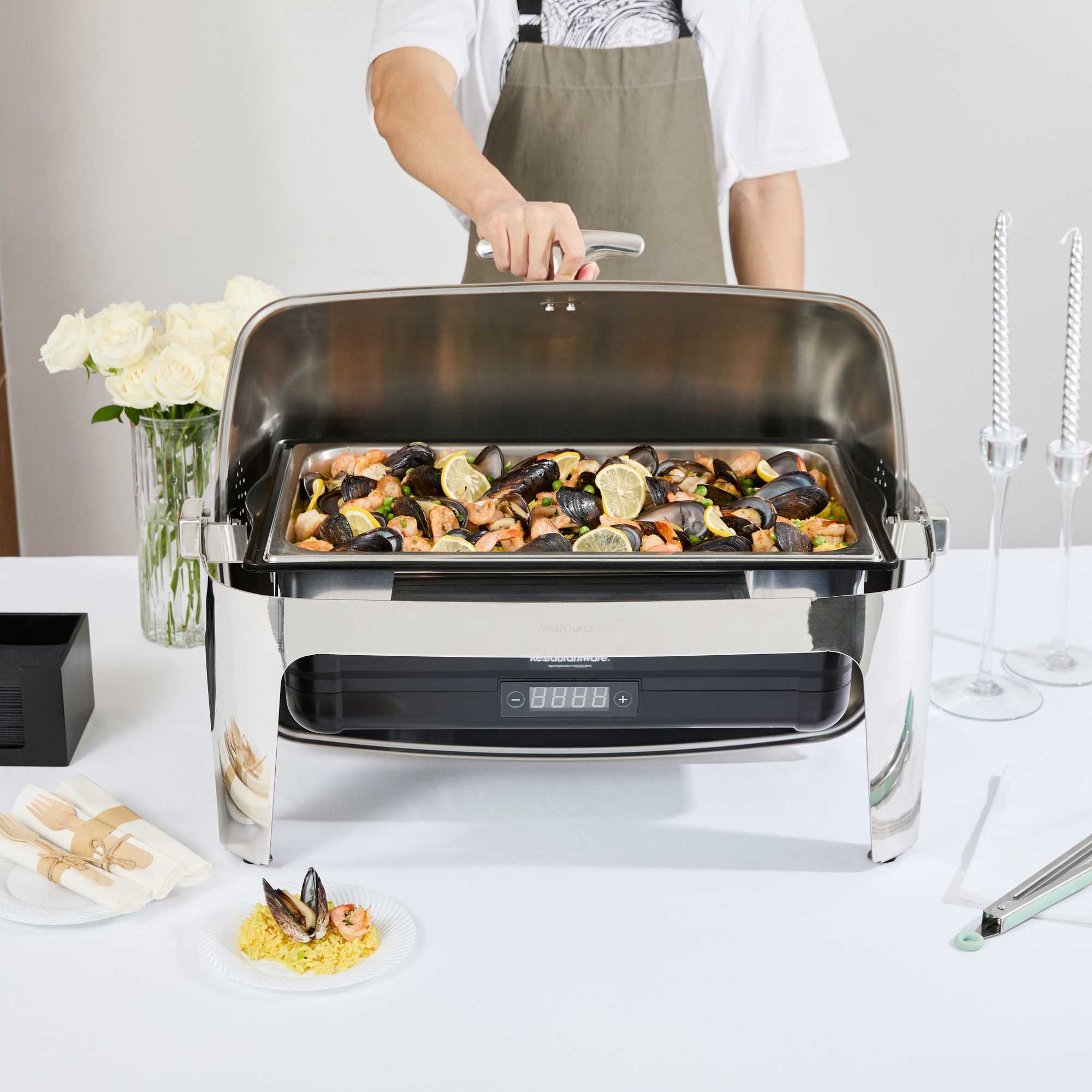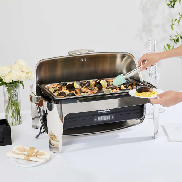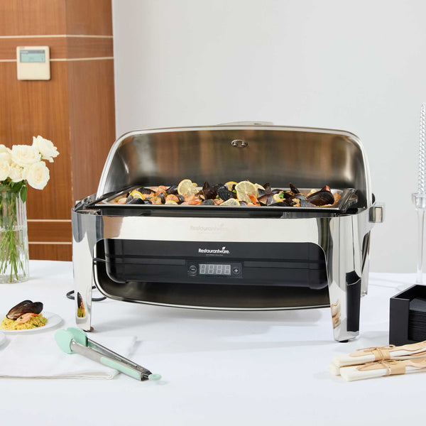 Ensure precision temperature control and seamless buffet service with our Cater Tek 14-quart Full Size Electric Chafer with Roll Top Cover. Equipped with a powerful 760-watt heating element and 120V input, this electric chafer delivers steady, reliable heat to maintain ideal serving temperatures throughout extended service hours. Its integrated digital temperature control with an automatic thermostat cut-off ensures accurate heat regulation and added safety in high-traffic foodservice environments. Designed with a full-size 14-quart capacity, it’s ideal for presenting hot mains and sides at catered events, weddings, and banquets. This unit features a smooth-glide roll top cover for effortless access, a generous food pan, and a durable stand for secure placement. Measuring 26.38 inches in length, 19.29 inches in width, and 18.11 inches in height, this electric chafer combines performance, practicality, and polished presentation. Sold in a 1 count box.