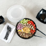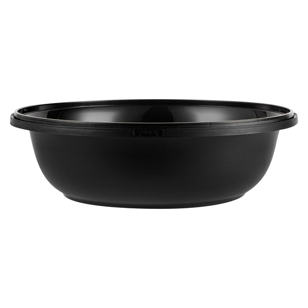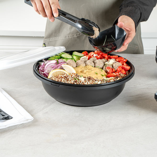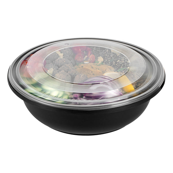Elevate your food presentation with our Cater Tek 142-ounce Round Black Plastic Catering / Serving Bowls. These serving bowls come with clear lids that form a snug fit and help maintain freshness while enhancing the convenience of storage and transport. Designed to be microwave-safe, these plastic bowls can withstand temperatures up to 248F, making them perfect for reheating and serving dishes. Additionally, these plastic serving bowls are freezer-safe, ideal for storing your leftovers. Crafted from premium plastic, these disposable bowls are suitable for holding both hot and cold food items. These large serving bowls are disposable, allowing for straightforward cleanup after events. Dimensions of these plastic bowls with lids are 11.85 inches in diameter by 4.02 inches in height and can hold up to 142 ounces, providing ample capacity for your culinary creations. Sold in a 50 count box.