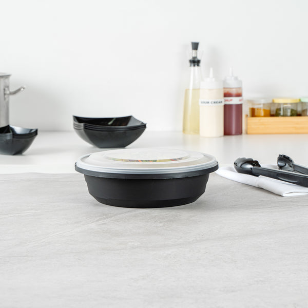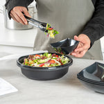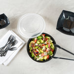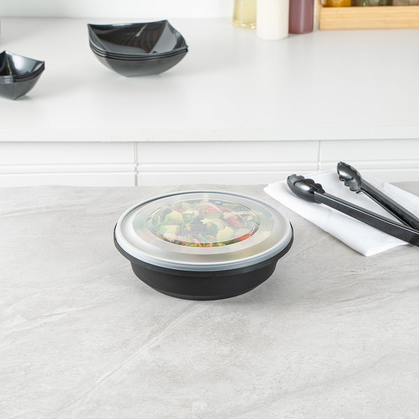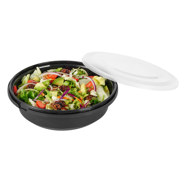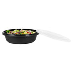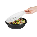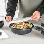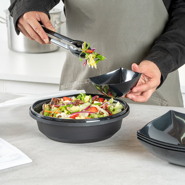 Enhance your catering and serving experience with our Cater Tek 68-ounce Round Black Plastic Catering / Serving Bowls. These disposable bowls come with clear lids that form a snug fit and help maintain freshness while enhancing the convenience of storage and transport. Made from premium plastic, these serving dishes are microwave-safe and can withstand temperatures up to 248F, making them ideal for reheating. These large serving bowls are freezer-safe, allowing you to store your leftovers with ease. Crafted to hold both hot and cold food items, these plastic bowls ensure versatility in any foodservice setting. These serving bowls are disposable and can be discarded after use for straightforward cleanup, saving you time and effort. With a generous capacity of 68 ounces and dimensions of 9.65 inches in diameter by 3.07 inches in height, these plastic bowls with lids are perfect for large servings. Sold in a 100 count box.