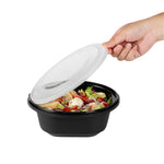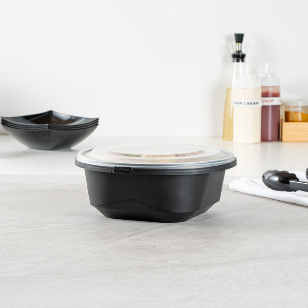 Elevate your food presentation with our Cater Tek 85-ounce Round Black Catering / Serving Bowls. These serving bowls come with clear lids that form a snug fit and help maintain freshness while enhancing the convenience of storage and transport. Designed to be microwave-safe, these black plastic bowls can withstand temperatures up to 248F, ensuring your meals stay warm. For added versatility, these serving dishes are also freezer-safe and can be used to store your leftovers. Crafted from premium plastic, these disposable bowls are ideal for holding both hot and cold food items. With their disposable design, these plastic bowls make cleanup straightforward and hassle-free. Measuring 9.65 inches in diameter by 3.86 inches in height, these plastic bowls with lids have a total capacity of 85 ounces, perfect for catering large events. Sold in 100 count box.
