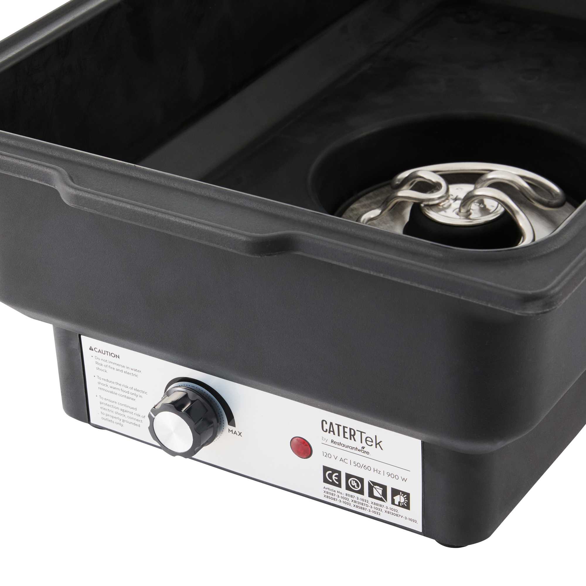 Maintain food quality and serving efficiency with our Cater Tek 9-quart Full Size Electric Chafer. Engineered with a dependable 760-watt heating element and powered by 120 volts, this electric chafer provides steady, even heat to keep dishes at ideal serving temperatures throughout service. The included stainless steel roll top cover ensures easy access while retaining heat and shielding food. Its full-size 9-quart food pan is ideal for presenting hot entrees, side dishes, and more at weddings, buffets, and catered events. A durable stand adds stability and enhances table presentation for seamless service in high-volume settings. Measuring 13.78 inches in length, 14.57 inches in width, and 10 inches in height, this electric chafer blends durability, performance, and style for any professional catering setup. Sold in a 1 count box.