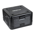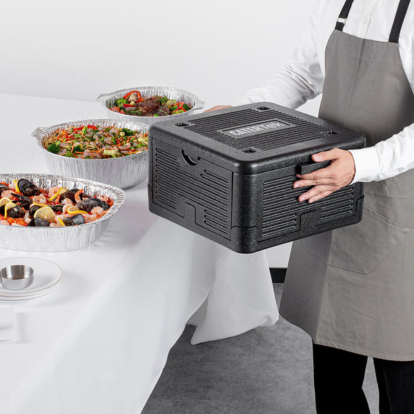 Optimize your food transport with our Cater Tek Black EPP Food Pan Carrier. Made from expanded polypropylene (EPP), this food pan carrier offers exceptional thermal insulation and ensures your food stays at the desired temperature for up to 6 hours, whether hot or cold. The top loading design of this insulated food carrier can accommodate a full-size 8" deep food pan, a 6" deep and 2 1/2" deep pan, one 4" deep pan, and two 2 1/2" deep pans, or up to three 2 1/2" deep pans. For space-saving convenience, this insulated carrier has a clever collapsible design, allowing it to be folded down to the size of a typical insulated food delivery bag. This insulated food pan carrier is durable and is built to withstand multiple impacts without compromising its integrity. Featuring molded handles on either side, this hot food carrier provides an ergonomic grip, ensuring comfort during transportation. This black food pan carrier measures 14.96 inches in length by 14.96 inches in width by 8.66 inches in height and can hold up to 14 quarts.. Sold in a 1 count box.