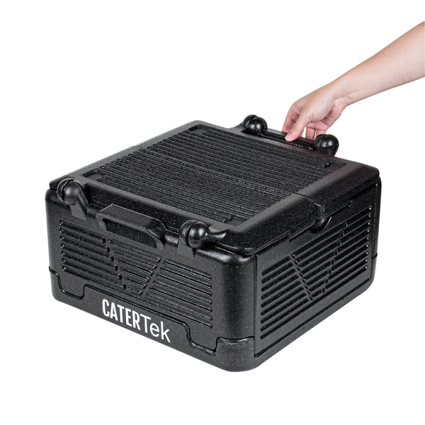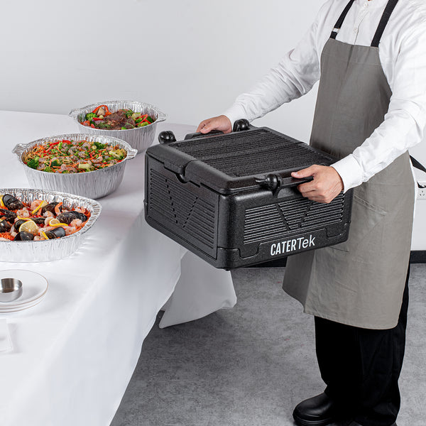 Effortlessly transport your culinary creations with our Cater Tek Black EPP Food Pan Carrier. Made from expanded polypropylene (EPP), this food pan carrier offers exceptional thermal insulation and keeps your food at the desired temperature for up to 6 hours. With a top loading design, this insulated food carrier provides versatile carrying options, accommodating up to one full-size 8" deep food pan or various combinations of smaller pans. For those with limited storage space, this insulated carrier features a clever collapsible design, reducing to the size of a typical insulated food delivery bag when not in use. This insulated food pan carrier is durable and can withstand multiple impacts, ensuring your meals remain intact in transportation. Built with molded handles on either side, this hot food carrier offers an ergonomic grip, making transportation comfortable and secure. This black food pan carrier measures 16.73 inches in length by 16.73 inches in width by 9.06 inches in height and can hold up to 25 quarts. Sold in a 1 count box.