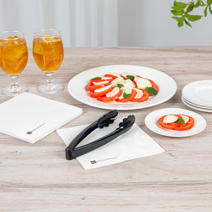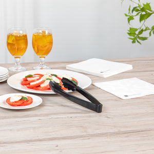 Easily handle and serve food with our Cater Tek Black Heavy-Duty Disposable Plastic Tongs. Made from durable heavy-duty plastic, these serving tongs are built to last, resisting breakage for reliable use. The scalloped edges of these tongs for salad offer a secure grip on various foods, ensuring smooth and mess-free serving. Designed from food-grade plastic, these disposable tongs provide a safe and hygienic option for all food-handling needs. With a temperature range of -40°F to 176°F, these tongs are versatile for serving salads, appetizers, desserts, and more. Featuring long and sturdy handles, these serving tongs offer an extended reach and a firm grip, allowing for easy and controlled serving while keeping hands away from food. Designed for single-use convenience, these recyclable plastic tongs make post-event cleanup effortless. Ideal for catering services, buffets, and weddings, these plastic serving tongs help maintain cleanliness at self-serve stations. Measuring 9 inches in length by 3.5 inches in width by 1.25 inches in height, these tongs offer an extended reach for convenient serving. Sold in a 10 count box.