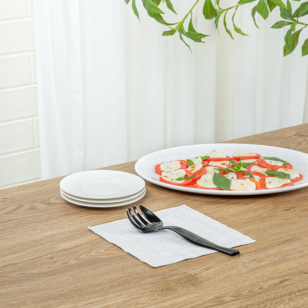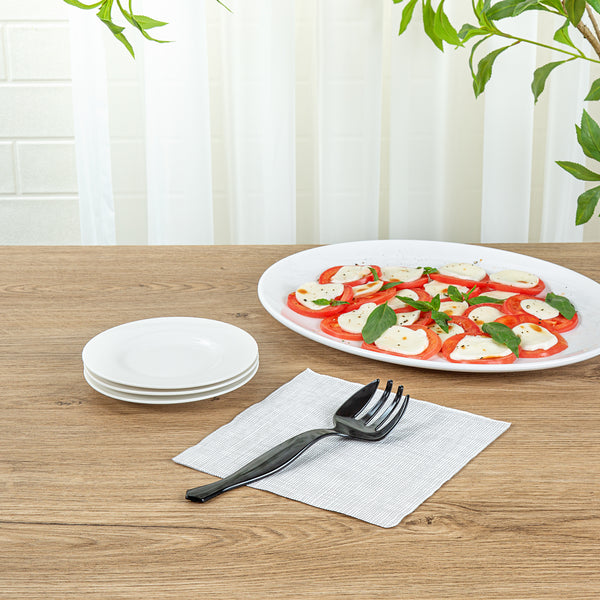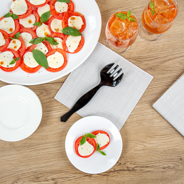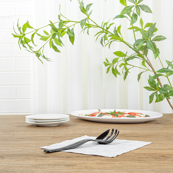 Easily serve food at catering events with our Cater Tek Black Plastic Serving Forks. Equipped with four prongs, these serving forks are designed to efficiently grasp and serve a variety of foods with precision and ease. Featuring an ergonomic handle, these salad forks provide a comfortable grip and enhanced control while handling food. Created from premium plastic, these disposable forks are suitable for serving various hot and cold food items at your catering events. For convenience, these disposable plastic forks can be discarded after use, simplifying post-event cleanup. The black finish of these plastic forks adds a sleek and sophisticated touch, enhancing their appeal for any occasion. These black plastic forks measure 8.5 inches in length by 2.36 inches in width. Sold in a 100 count box.