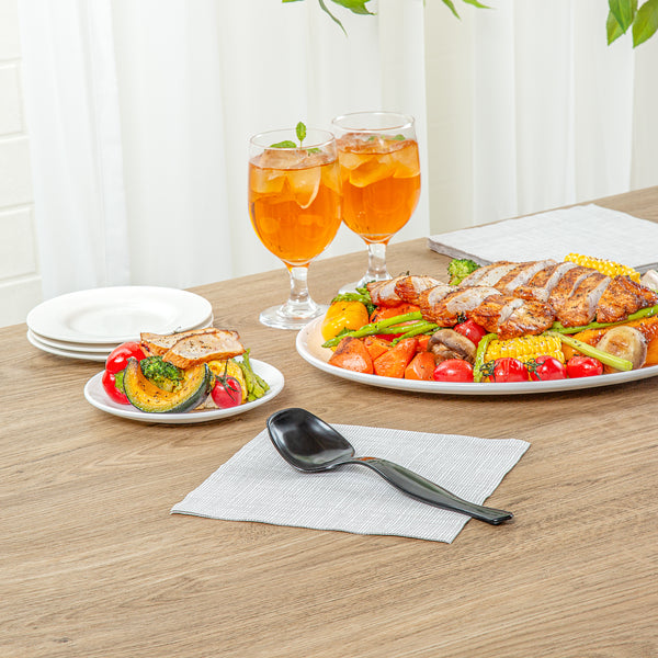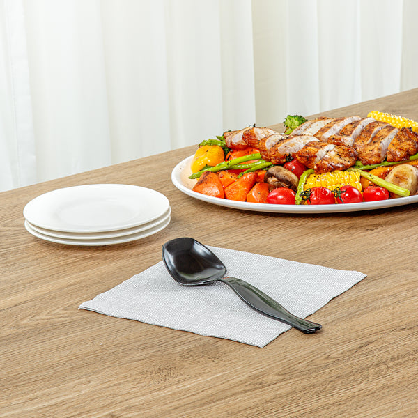 Enhance your foodservice experience with our Cater Tek Black Plastic Serving Spoons. These large serving spoons feature a generously sized bowl, perfect for scooping and serving substantial portions of food effortlessly. The ergonomically designed handle of these plastic serving spoons ensures a comfortable grip, making serving easy and reducing hand strain. Crafted from premium plastic, these disposable spoons are ideal for serving a variety of hot and cold dishes, from soups and stews to salads and desserts. With their disposable design, these plastic spoons promote fast and efficient cleanup after your event. Measuring 8.5 inches in length by 2.36 inches in width by 1.38 inches in height, these serving spoons are sized for convenience and versatility. Sold in a 100 count box.