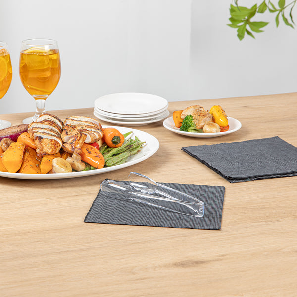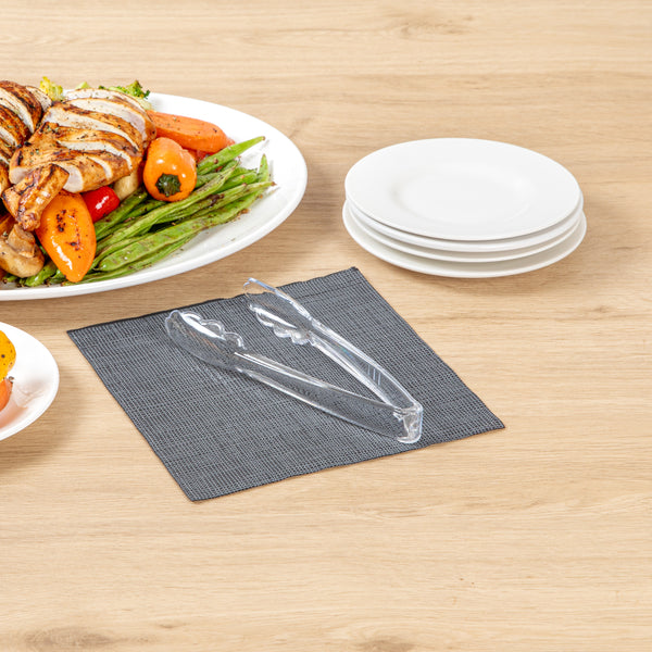 Serve a variety of your dishes with our Cater Tek Clear Heavy-Duty Disposable Plastic Tongs. Made of heavy-duty plastic, these serving tongs are designed for durability and reliable performance without breaking easily. The scalloped edges of these salad tongs ensure a secure grip on a variety of foods, making serving effortless and preventing accidental drops. These food tongs are food-grade, guaranteeing safety and quality for all your culinary needs. With a temperature tolerance from -40°F to 176°F, these disposable tongs are ideal for serving salads, desserts, appetizers, and more. Designed with sturdy handles, these serving tongs provide a comfortable grip and are strong enough to handle larger food items with ease. To simplify cleanup, these food tongs are conveniently disposable and recyclable, making them an excellent choice for catered events, buffets, and weddings. Ideal for maintaining hygiene at self-service stations, these plastic serving tongs are both practical and efficient. Measuring 7 inches in length by 2 inches in width by 1.25 inches in height, these tongs are compact yet highly functional. Sold in a 100 count box.