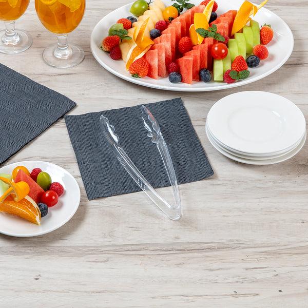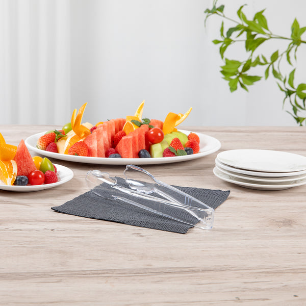 Upgrade your serving experience with our Cater Tek Clear Heavy-Duty Disposable Plastic Tongs. Crafted from durable heavy-duty plastic, these serving tongs are strong enough to handle repeated use without breaking. The scalloped edges of these tongs for salad provide a firm grip on different food items, making serving effortless and preventing accidental spills. Made from food-grade plastic, these food tongs are ideal for all culinary applications. With the ability to withstand temperatures from -40°F to 176°F, these disposable tongs are perfect for serving a variety of dishes, including appetizers, salads, and desserts. Equipped with long and sturdy handles, these serving tongs allow for a comfortable grip and extended reach, making foodservice more efficient. Designed for easy disposal, these recyclable tongs ensure quick cleanup after events. A practical choice for catering businesses, buffets, and self-serve stations, these disposable plastic tongs help maintain sanitation in any foodservice setting. Measuring 9 inches in length by 3.5 inches in width by 1.25 inches in height, these tongs provide ample reach for smooth serving. Sold in a 100 count box.