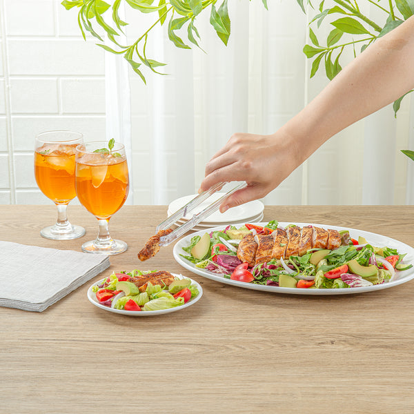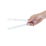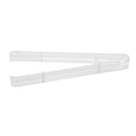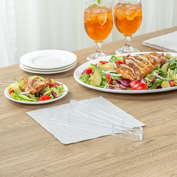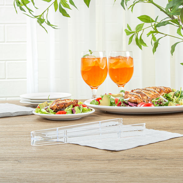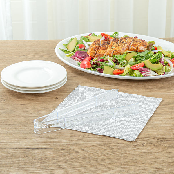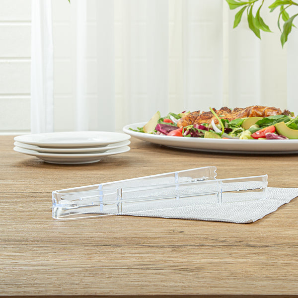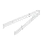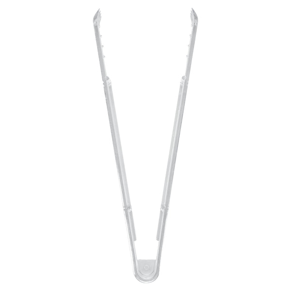 Ensure easy food presentation with our Cater Tek Clear Plastic Tongs. These serving tongs have serrated tips, providing a firm hold on food items and preventing slipping for better control. Crafted from premium plastic, these salad tongs are durable and sturdy, making them suitable for serving hot and cold food items. Boasting a heavy-duty design, these plastic plating tongs withstand frequent use in high-traffic service, ideal for bustling buffets and catering events. Designed with long handles, these plastic tongs make serving and handling food easier by providing a comfortable grip and extended reach. These food tongs are disposable and can be tossed after use, providing a simplified cleanup after meals. With a clear finish, these disposable tongs creates a sophisticated look at your catering event. Measuring 9 inches in length by 3.54 inches in height, these appetizer tongs offer functionality and ease of handling. Sold in a 100 count box.