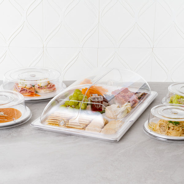Our polycarbonate plate covers come in various sizes and shapes to meet your different tray covering needs. Ideal for large or small meals!