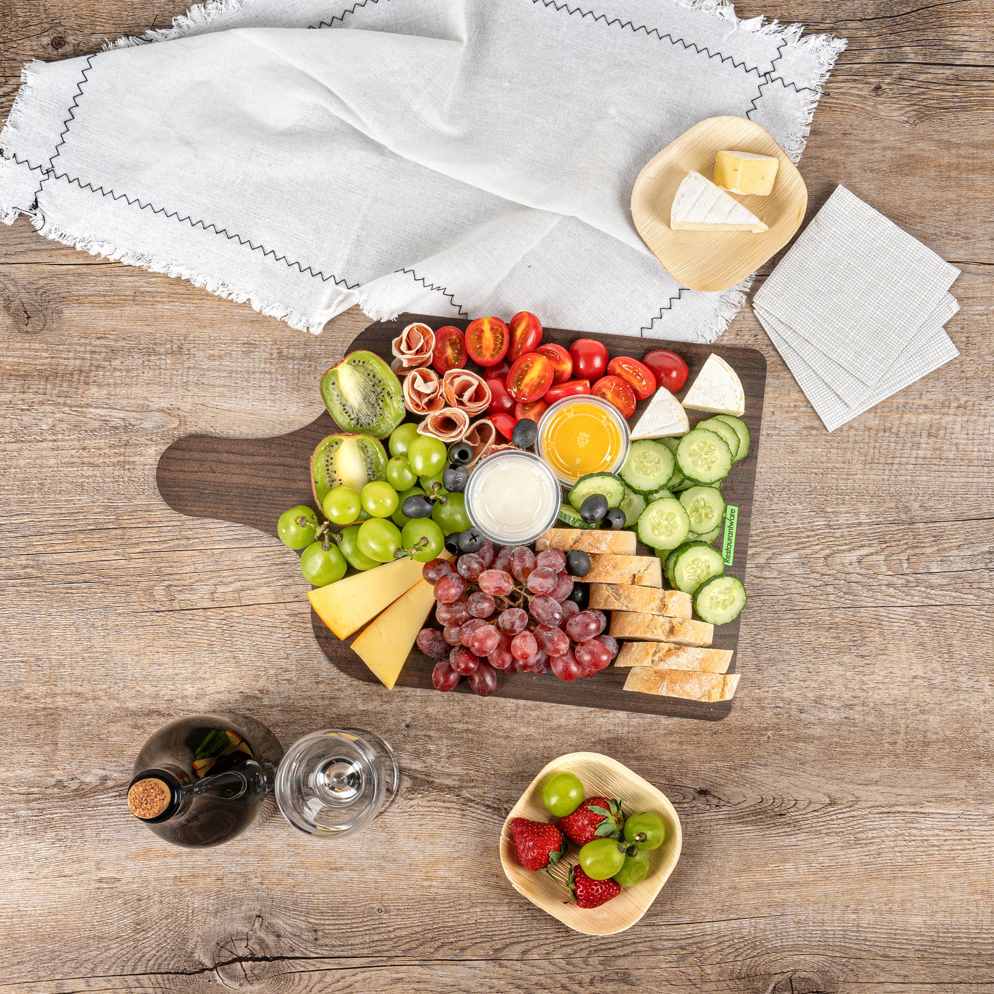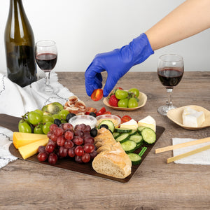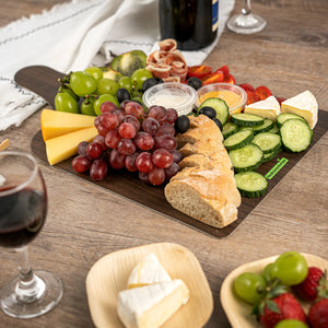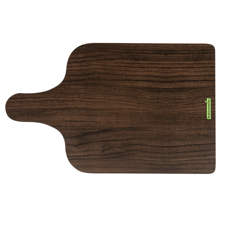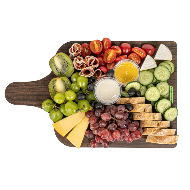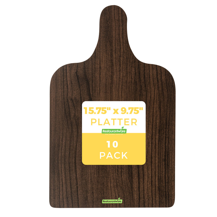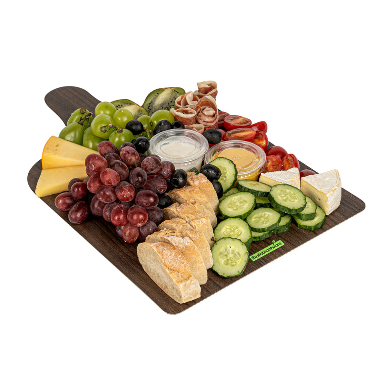 Uplift your food presentation with our Cater Tek Dark Cheese / Charcuterie Boards. Crafted with durable paper material, these food trays are robust enough to hold an array of cheeses, meats, fruits, and more. The faux wood finish gives these serving trays a sophisticated and rustic appearance, perfect for adding a touch of elegance to any event or establishment. Plus, the convenient side handle simplifies the handling and transport of these catering trays, offering comfort and ease for your staff. These paper food trays are not limited to cold food serving but are also suitable for hot food, making them a versatile addition to your food service supplies. Stackable by design, these disposable food trays facilitate efficient storage. The disposable design of these trays makes cleanup a breeze. Measuring 15.8 inches in length by 9.8 inches in width, these food platters provide ample space for an assortment of delicious treats. Sold in a 10 count box.