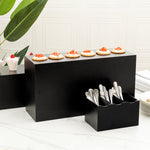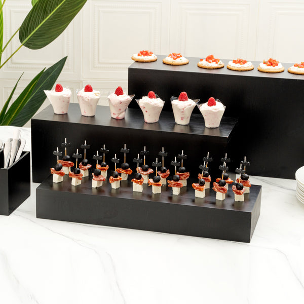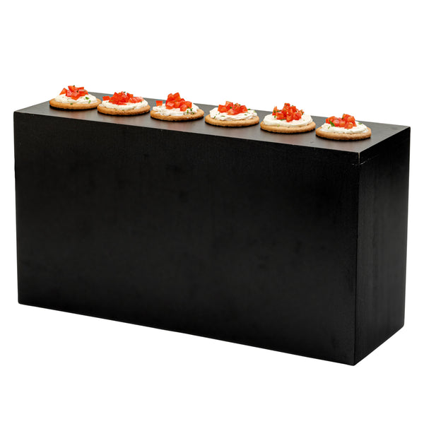Your displays will rise above the rest with our Cater Tek Rectangle Black Bamboo Tall Riser. This wood display riser presents your desserts, appetizers, samples, hor d' oeuvres, and featured dishes at an elevated height to spark the interest of all your customers. The rectangular design of this table display riser is perfect for arranging your dishes in rows to display variety. Equipped with 4 sturdy sides, this rectangle riser stands high to showcase your featured products and attract customers. Constructed from durable bamboo, this display riser is shatterproof and chip-resistant, perfect for consistent use in a candy shop, bakery, buffet, catering service, or restaurant. The black finish on the natural wood grain pattern of this buffet food display stand adds a sophisticated charm to your presentations. This catering display riser measures 20.5 inches in length by 7 inches in width by 11 inches in height. Sold in a 1 count box.