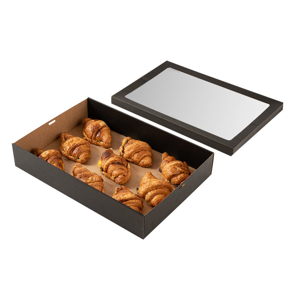 Make use of our Cater Tek Rectangle Black Paper Catering Boxes to accommodate guests' takeaway or delivery orders. These boxes come with a lock-in tab to ensure the containment of items during the journey. With lids integrated, these cardboard catering boxes bear a transparent window that grants customers a peek into their orders. These catering boxes have a grease-resistant construction to prevent the messy seepage of oils. The black finish of these capped catering boxes contributes a rustic charm to your establishment's to-go amenities. For convenient storage, these windowed catering boxes are shipped flat, aiding easy assembly. These black paper catering boxes are recyclable, making the clean-up hassle-free for your staff and customers. Measuring 18 inches in length by 12.25 inches in width by 3.25 inches in height, these cater boxes with windows are ideal for holding an array of dishes. Sold in a 10 count box.