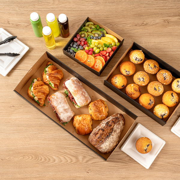 Present your catered dishes distinctly with our Cater Tek Rectangle Black Paper Catering Boxes. Outfitted with securing tab locks, these catering boxes offer a robust solution to safeguard on-the-move meals. These catering food receptacles are engineered to resist grease, effectively halting any messy oil leaks. Crafted from durable paper, the lidded catering boxes can take on an assortment of food items with ease. These cardboard catering boxes, adorned with lids that have a transparent window, allow a peek into the items while keeping them tidily packed away. For hassle-free packaging, these windowed catering boxes arrive flat for storage efficiency and can be assembled swiftly. To facilitate a swift and environmentally-conscious clean-up, these black paper catering boxes are recyclable. Measuring 22.25 inches in length by 10 inches in width by 3.25 inches in height, these windowed catering boxes make an ideal choice for catered meals or abundant grazing boxes. Sold in a 10 count box.
