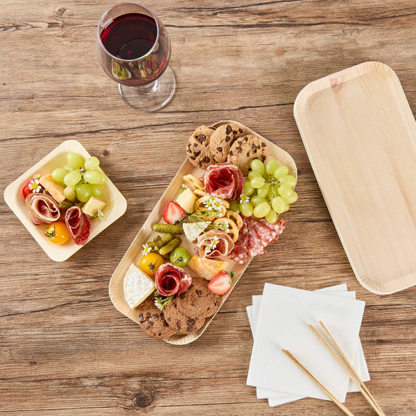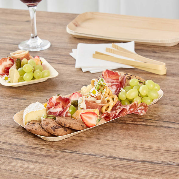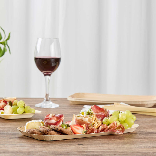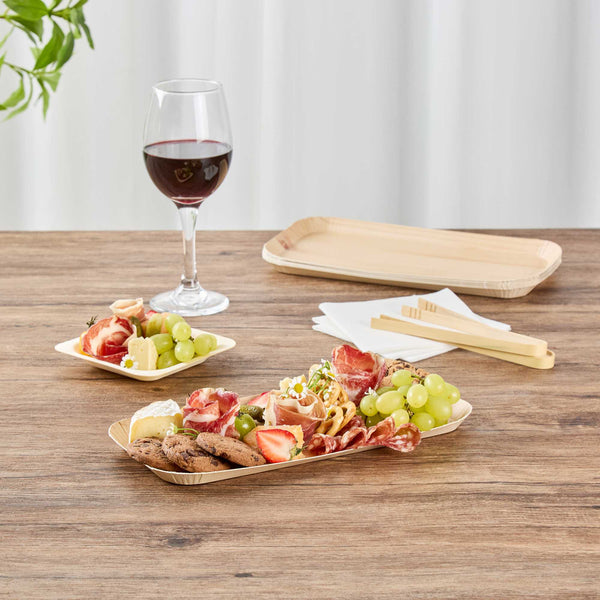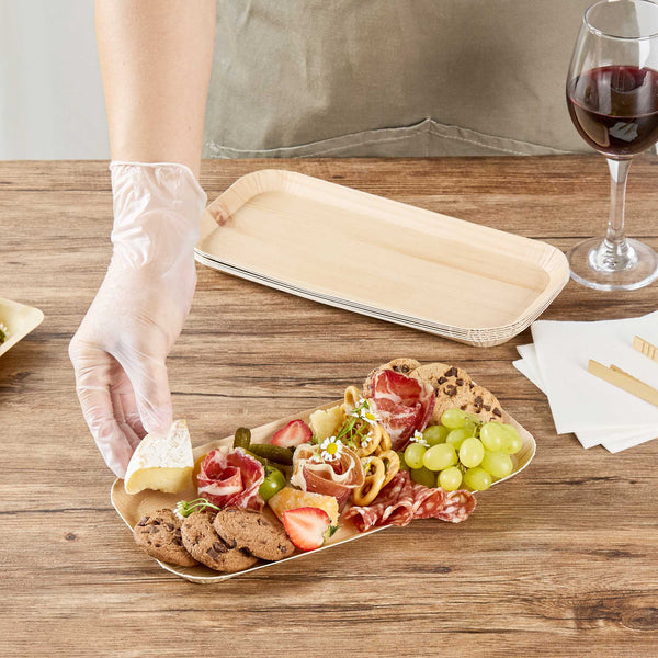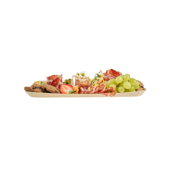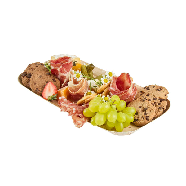 Elevate your food presentation with our Cater Tek Rectangle Food Trays. These food trays are designed to be sturdy and reliable, made from durable paper material that's perfect for serving both hot and cold dishes. The faux wood finish of these serving trays adds an elegant touch to your catering setup, making them ideal for bakeries, restaurants, bistros, and caterers. With elevated sides, these rectangle food trays avert food from sliding off, ensuring a clean and tidy serving experience. Plus, these stackable food trays make storage a breeze, saving you valuable space in your kitchen or serving area. Measuring 10.5 inches in length by 5 inches in width, these catering trays provide ample space for various food items, from sandwiches and pastries to salads and hors d'oeuvres. Sold in a 100 count box.