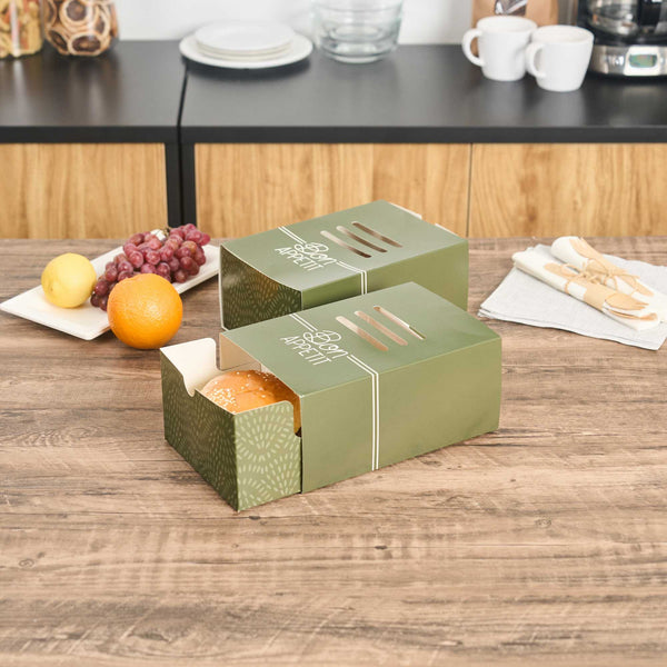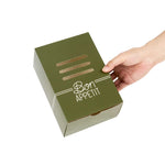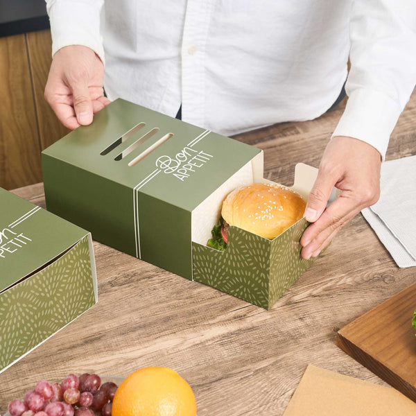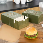 Ensure secure food transport with takeout boxes. Cater Tek Green Paper Takeout Boxes are crafted from food-grade cardboard, providing safe, hygienic packaging for your culinary creations. Their freezer-safe design preserves the freshness of stored items, making them perfect for burger packaging in busy kitchens. With dimensions of 8.3 inches in length, 5.7 inches in width, and 3.7 inches in height, these paper food boxes efficiently fit a variety of entrees while their simple design offers a clear view of contents, enhancing the display and boosting customer engagement. Ideal for eco-conscious establishments, these recyclable boxes help promote sustainability without compromising on quality. Elevate your takeout service and delight customers with reliable packaging solutions. Each order includes 100 Cater Tek Green Paper Takeout Boxes.