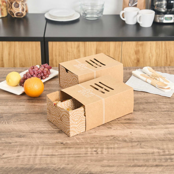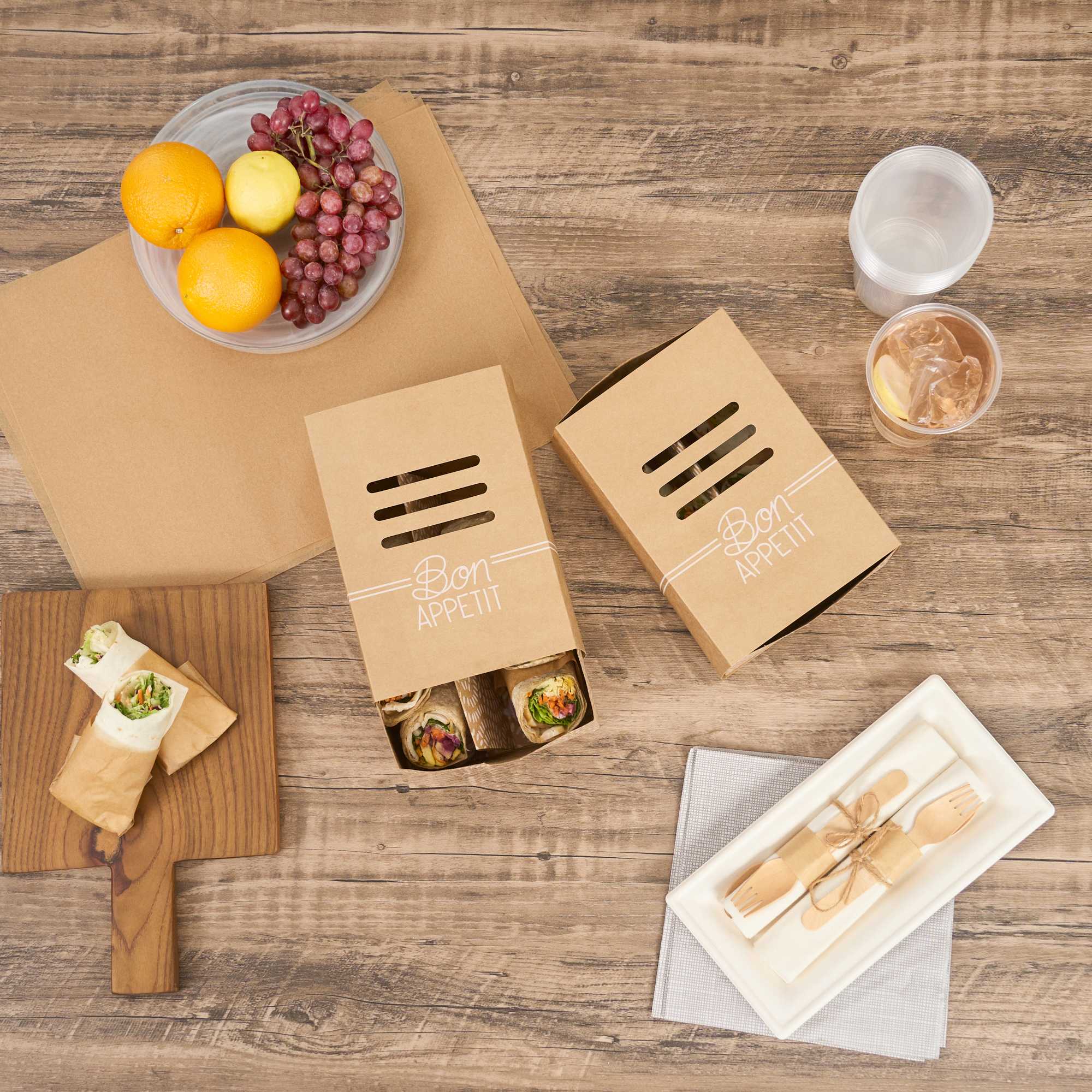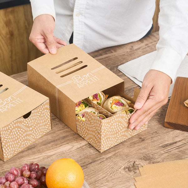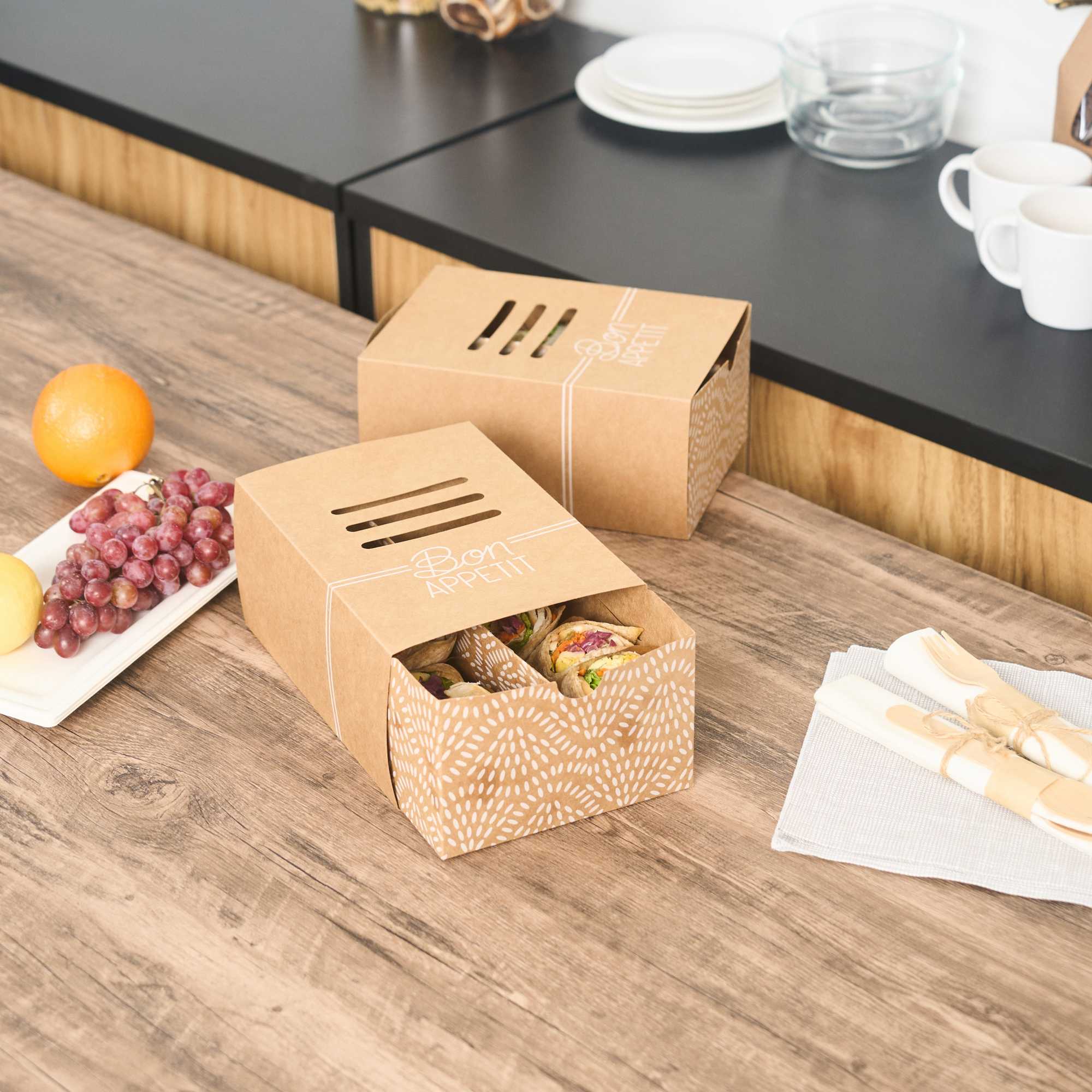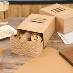 Keep hot dogs intact and sides separate in transit. The Cater Tek Kraft Paper Sandwich Takeout Box with Divider features a built-in divider to maintain food integrity, making it an essential sandwich takeout box for foodservice operations. An included cover protects meals from contaminants, ensuring your hot dog packaging keeps food fresh for takeout. Constructed from sturdy kraft paper, this kraft food container offers reliable support, preventing leaks and spills even with saucier dishes. Made from recyclable materials, this eco-friendly box appeals to environmentally conscious customers and enhances the visual appeal of meals with its simple design. Ideal for food trucks and concession stands, the convenient size of 8.3 inches by 5.7 inches optimizes packaging efficiency for standard hot dogs and sides. Elevate your food presentation and service with this versatile kraft food container. Each order includes 100 Cater Tek Kraft Paper Sandwich Takeout Boxes with Dividers.