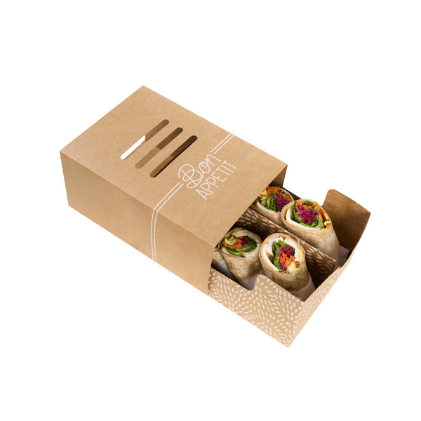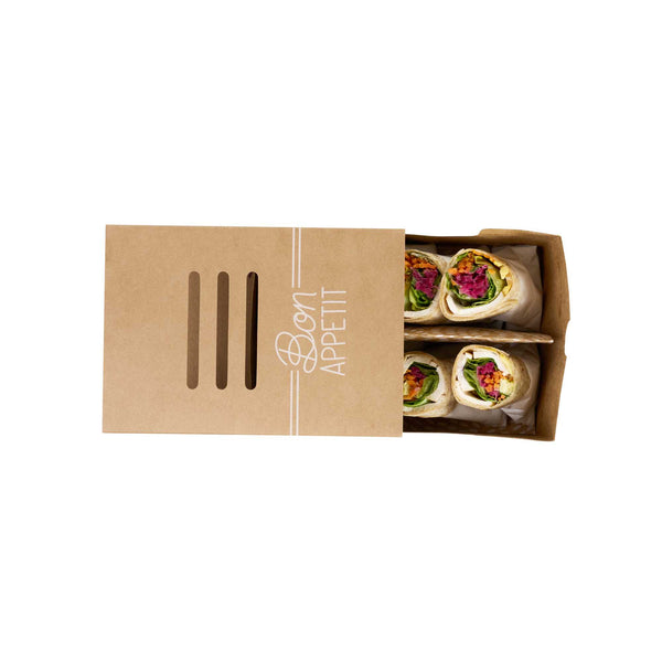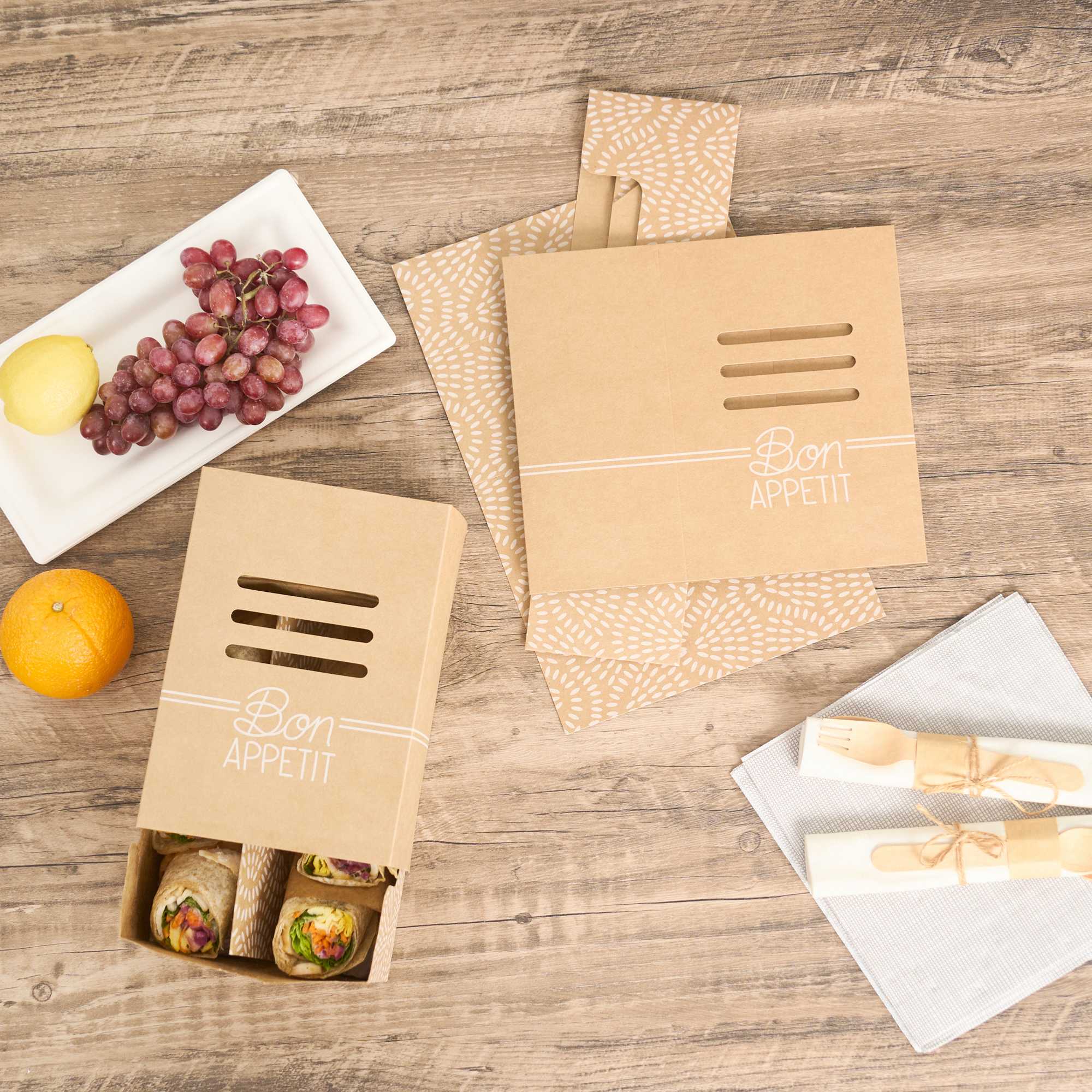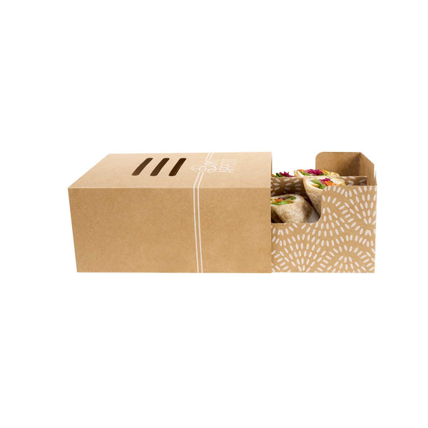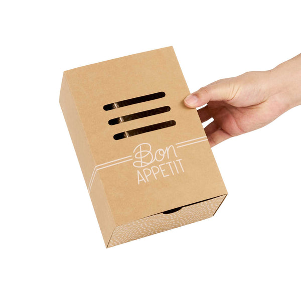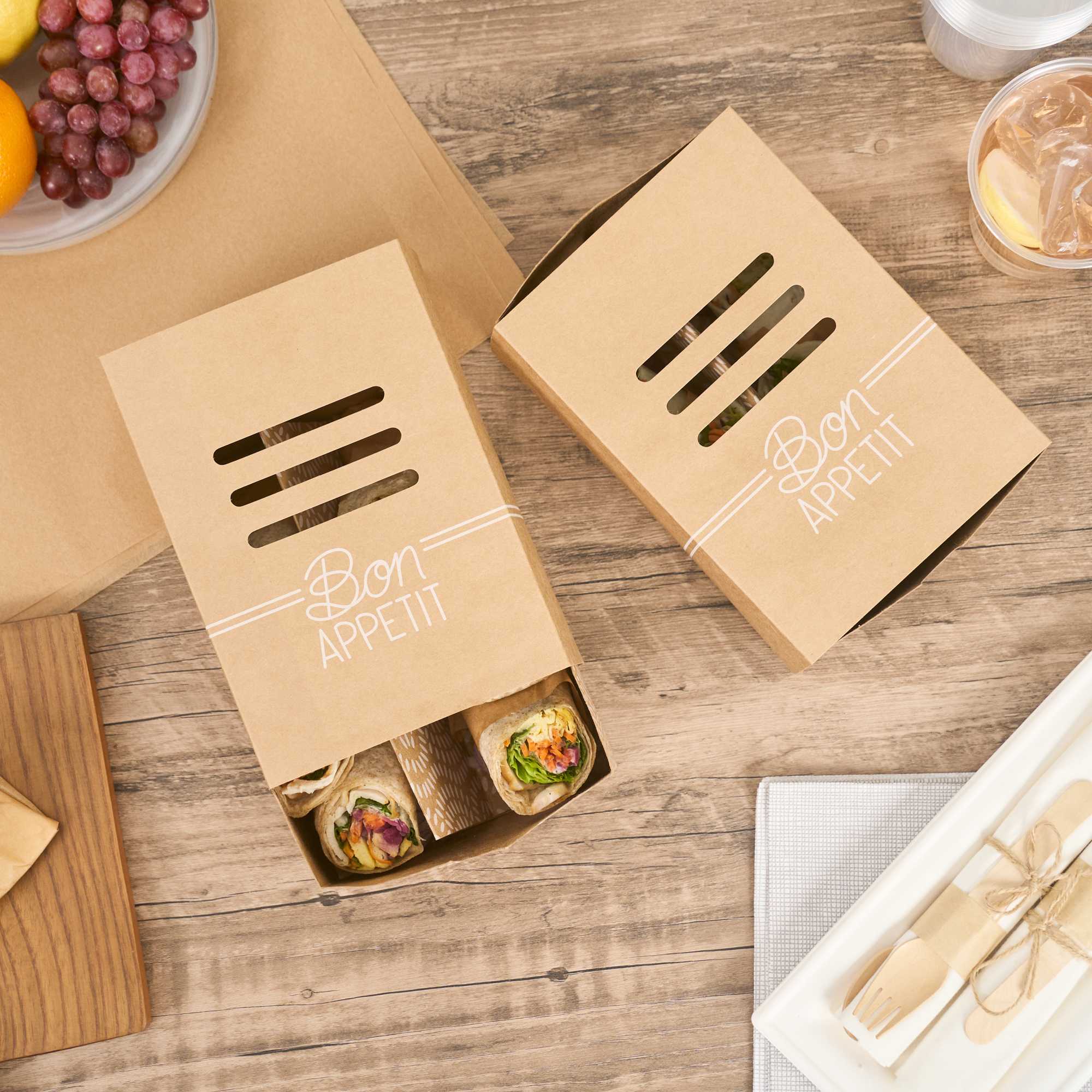 Keep hot dogs intact and sides separate in transit. The Cater Tek Kraft Paper Sandwich Takeout Box with Divider features a built-in divider to maintain food integrity, making it an essential sandwich takeout box for foodservice operations. An included cover protects meals from contaminants, ensuring your hot dog packaging keeps food fresh for takeout. Constructed from sturdy kraft paper, this kraft food container offers reliable support, preventing leaks and spills even with saucier dishes. Made from recyclable materials, this eco-friendly box appeals to environmentally conscious customers and enhances the visual appeal of meals with its simple design. Ideal for food trucks and concession stands, the convenient size of 8.3 inches by 5.7 inches optimizes packaging efficiency for standard hot dogs and sides. Elevate your food presentation and service with this versatile kraft food container. Each order includes 100 Cater Tek Kraft Paper Sandwich Takeout Boxes with Dividers.