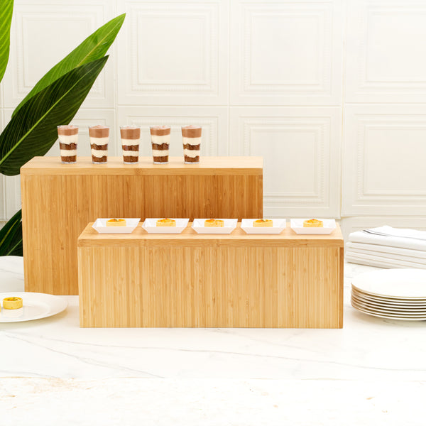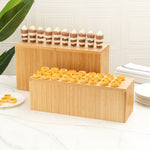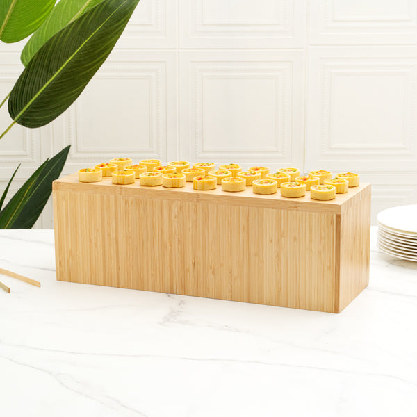 Call attention to your special treats using our Cater Tek Rectangle Natural Bamboo Medium Riser. This food display riser elegantly exhibits your appetizers, samples, desserts, featured dishes, and other non-food items. The rectangular design of this table display riser allows you to arrange dishes in a neat row for customers to easily make their selection. Featuring 4 built-in sides, this display riser presents your treats as the focal point of your table. The durable bamboo construction of this rectangular riser is shatterproof and chip-resistant, perfect for daily use in a buffet, bakery, restaurant, or catering service. This bamboo riser's natural wood grain adds a hint of rustic flair to any setting. This retail display riser measures 20.5 inches in length by 7 inches in width by 7 inches in height. Sold in a 1 count box.