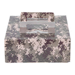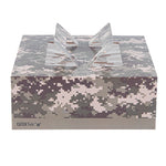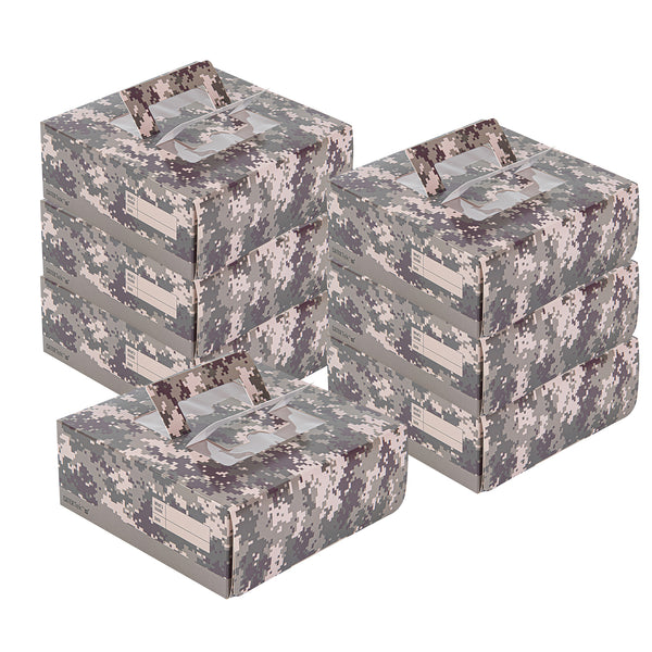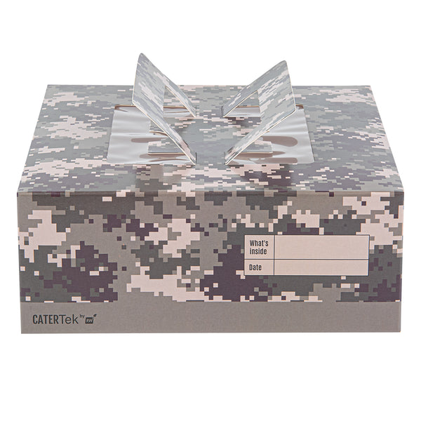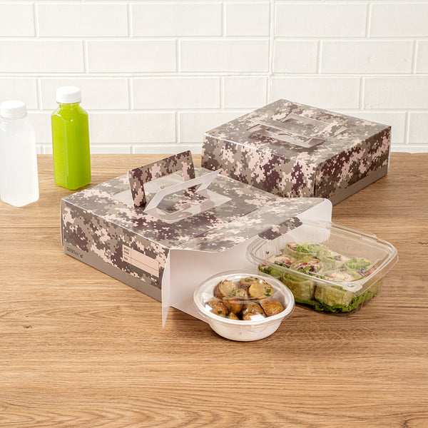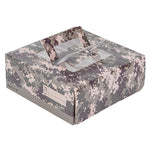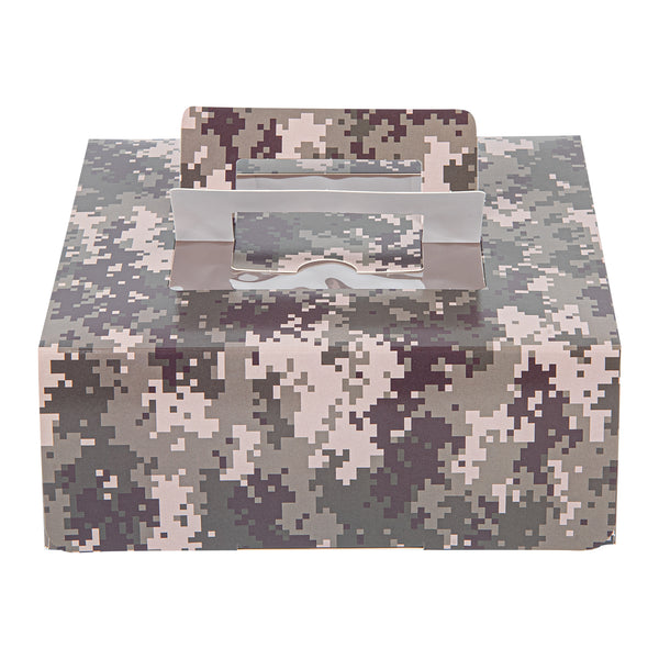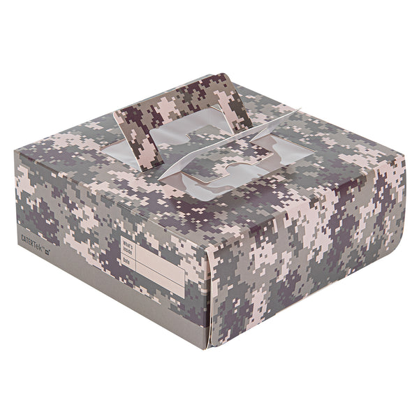Present your lunch and dessert orders in a unique way with our Cater Tek Square Camouflage Paper Cake / Lunch Box. These cake boxes are crafted from premium paper and comfortably supports a range of to-go meals and desserts. Featuring convenient pop-up handles, these camouflage paper lunch boxes provide employees with a secure grip during transport. The visible window of these disposable cake boxes allows for easy identification of contents without needing to open the box. These paper pie boxes have a grease-resistant coating that keeps buttery sweets or oily dishes contained and mess-free. The eye-catching camouflage print of these disposable lunch containers enhances the packaging at your establishment. These catering boxes are shipped flat and can be easily assembled to streamline service at your restaurants or cafes. Each paper cake box measures 9 inches in length by 9 inches in width by 3.5 inches in height. Sold in a 50 count box.