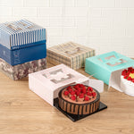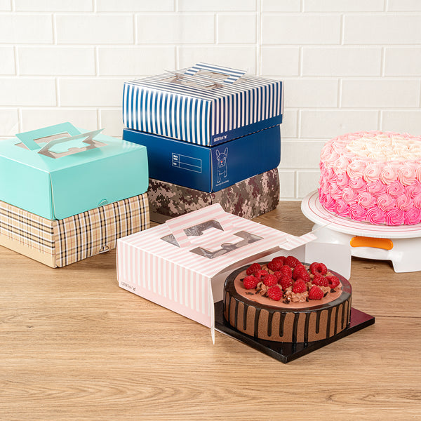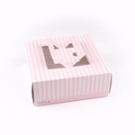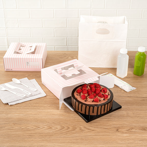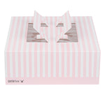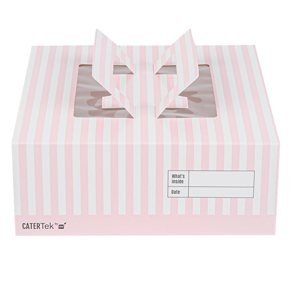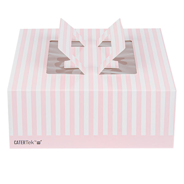 Add a touch of charm to your lunch or dessert orders with our Cater Tek Square Pink and White Stripe Paper Cake / Lunch Box. Constructed from durable paper, these disposable lunch containers hold heavy meals and desserts with ease. The convenient pop-up handles of these catering boxes provide a secure grip for employees while transporting orders. These cake boxes have built-in window display that enables swift identification without opening the box. The grease-resistant coating of these paper pie boxes ensures buttery frosting or oily dishes are contained and mess-free. These disposable cake boxes have delightful pink and white stripes that lends an elegant touch to your pre packaged goods. For space-saving storage, these striped cake boxes are shipped flat and can be easily assembled. These paper lunch boxes measure measures 9 inches in length by 9 inches in width by 3.5 inches in height. Sold in a 50 count box.