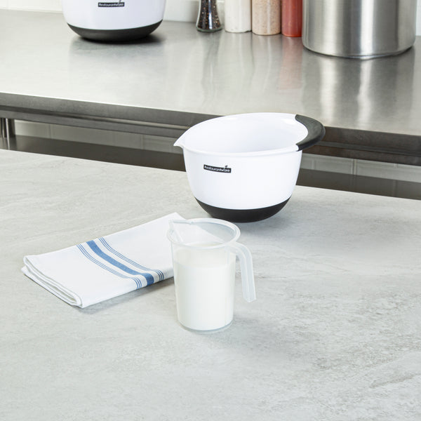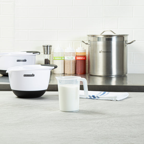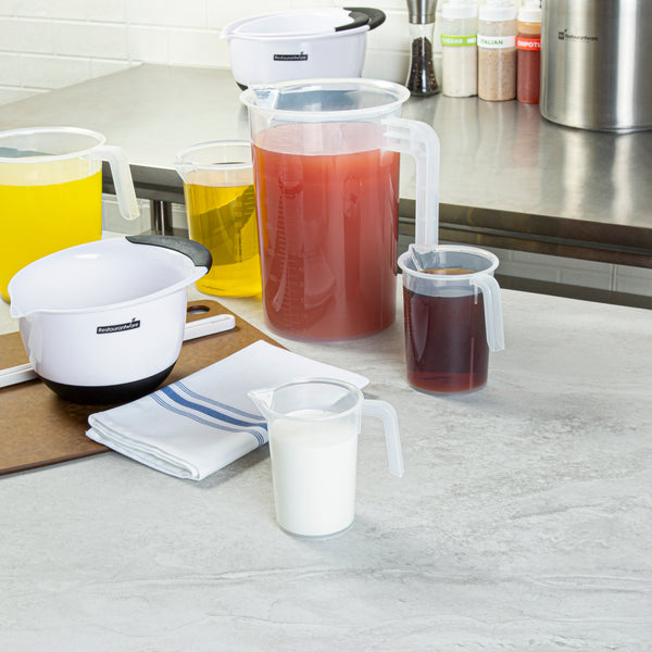 Measure ingredients with ease using our Chef 101 8-ounce Clear Plastic Measuring Cup, ideal for professional and home kitchens. Made from durable, food-grade plastic, this measuring beaker resists cracks and is built for long-lasting use. The embossed metric and imperial graduations ensure clear, precise measurements for both dry and liquid ingredients. Designed with a conical spout, this plastic measuring pitcher provides controlled pouring, whether you need a slow drizzle or a steady flow. The ergonomic I-beam handle with a thumb grip offers a secure hold, reducing spills for mess-free use. With a transparent body, this liquid measuring cup allows for easy content visibility. Measuring 3.7 inches in length by 2.5 inches in width by 4.3 inches in height, this plastic measuring container has a convenient 8-ounce capacity, perfect for smaller portioning needs. Sold in a 1 count box.