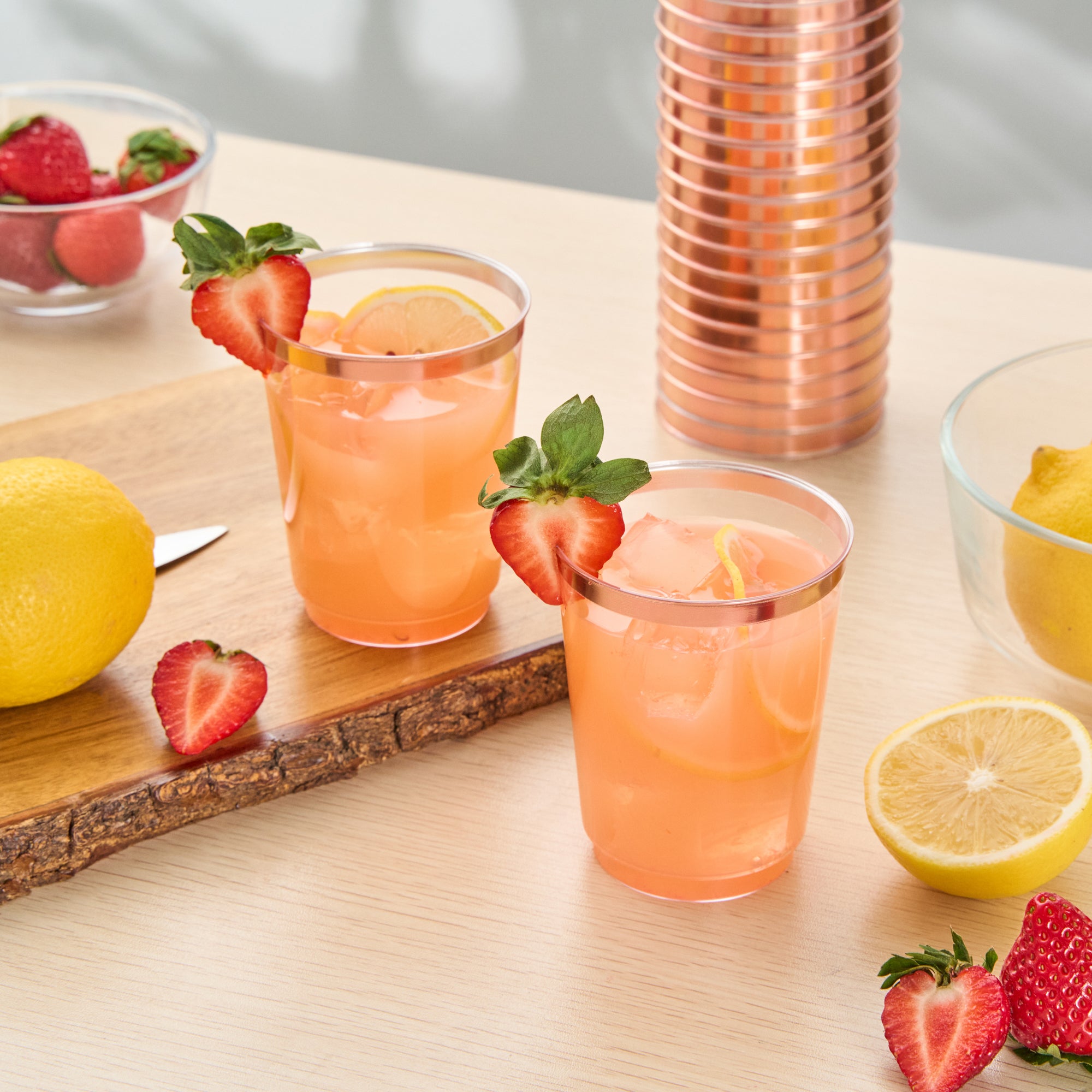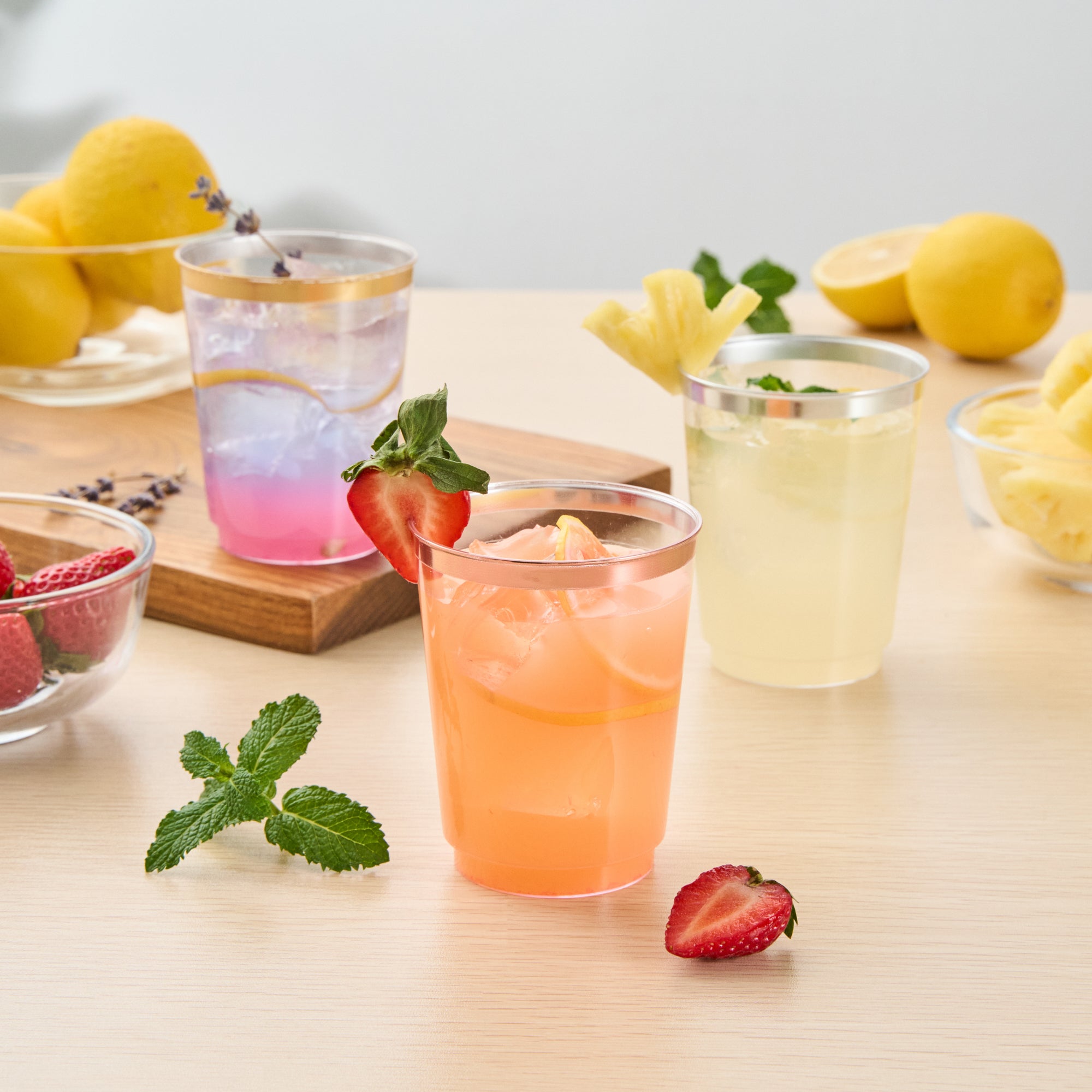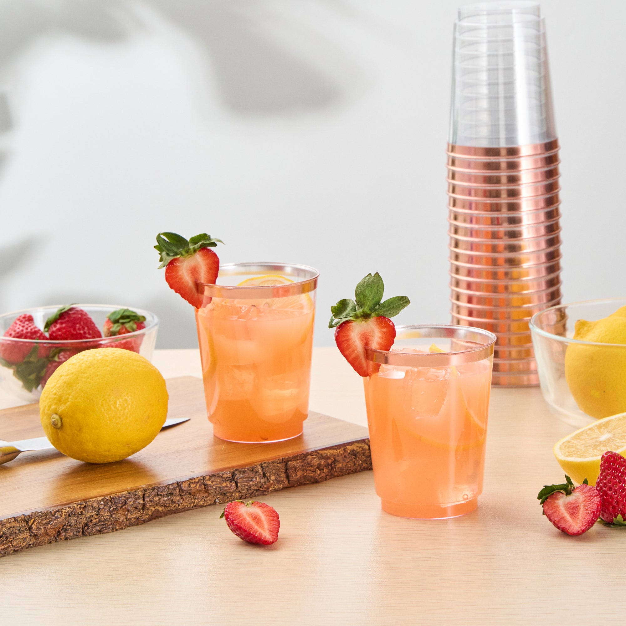 Enhance cocktail presentations with our Chef 101 10-ounce Clear Plastic Tumblers. These clear glasses feature a rose gold rim that elevates the appeal of any beverage service, making them ideal for upscale events like weddings and parties. Made from hard, durable PS plastic, these disposable glasses are recyclable, providing a striking combination of beauty and practicality. With a generous 10 ounce capacity, these clear tumblers are perfect for serving both cocktails and desserts. The plastic design ensures that these plastic glasses resist stains and maintain a clean look. Cold food-friendly and ideal for celebrations, these elegant cups pair seamlessly with any color beverage for a refined presentation. Measuring 2.95 inches in diameter and 3.8 inches in height, these 10-ounce plastic glasses are suitable for a variety of festive settings. Sold in a 20 count box.