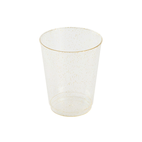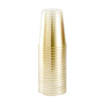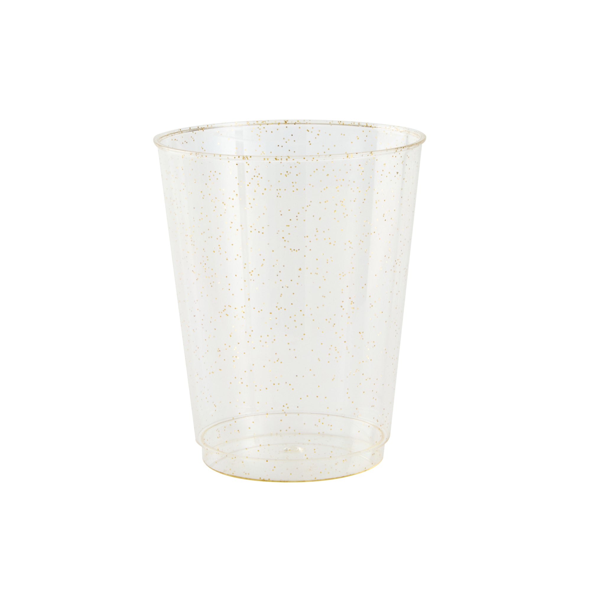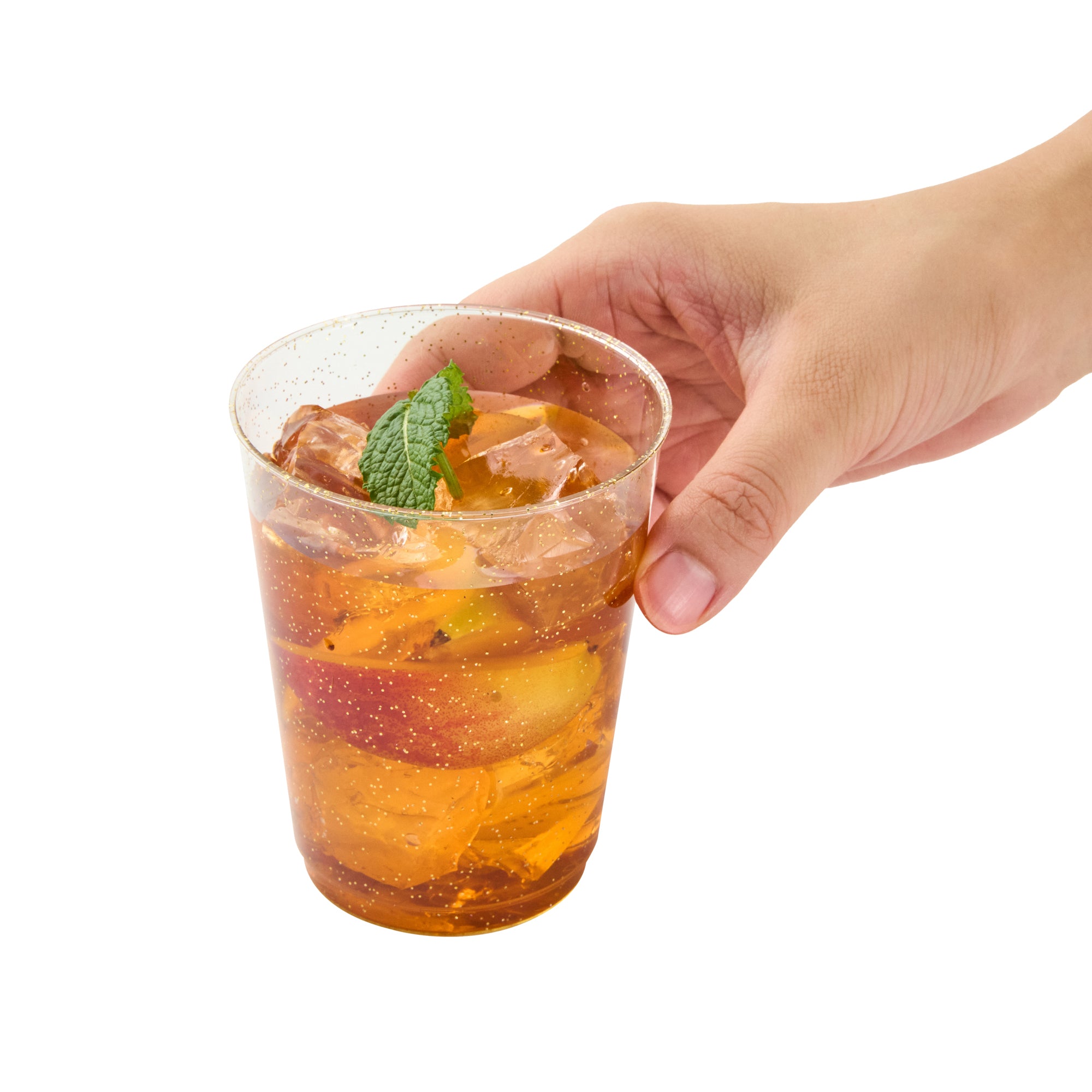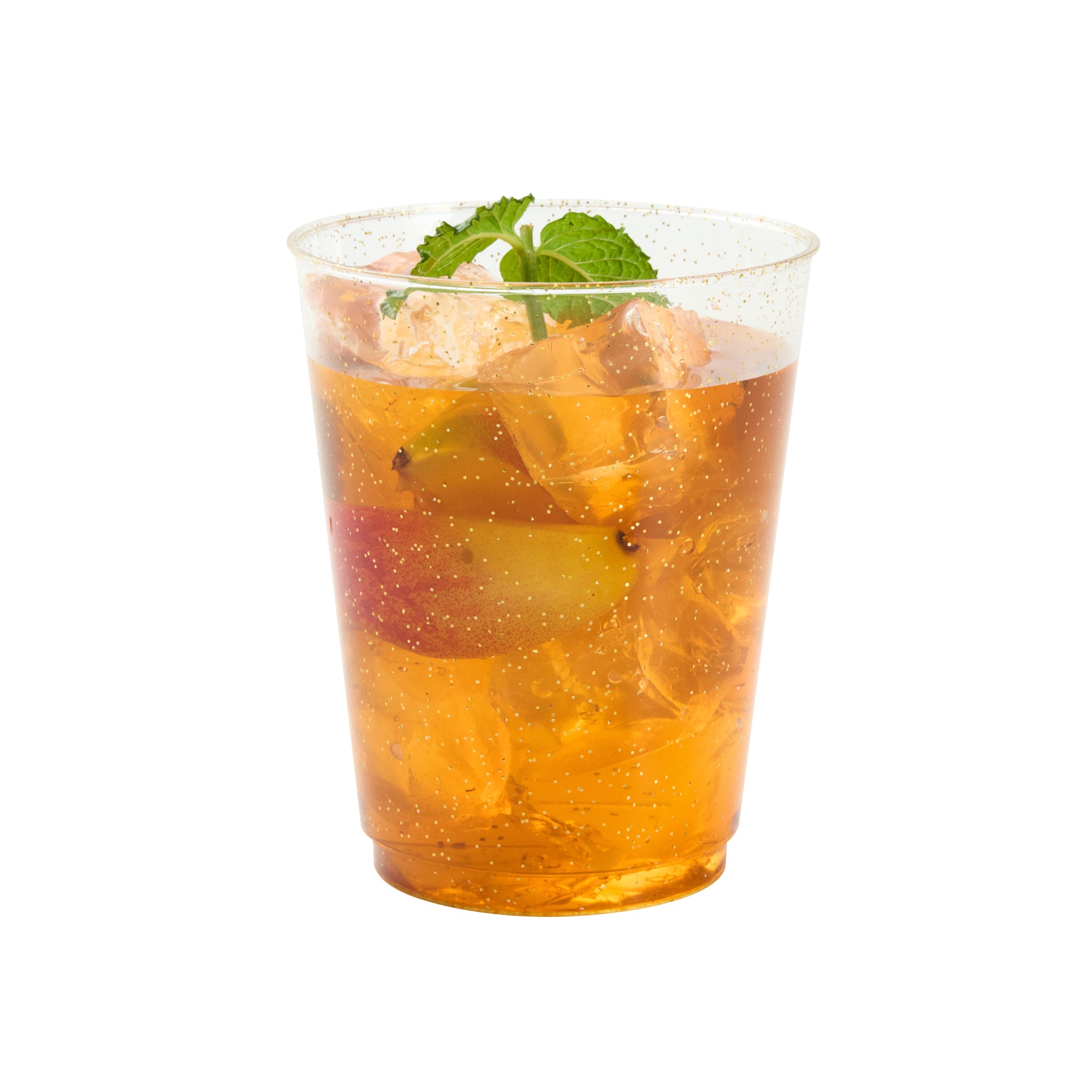 Elevate your event with our Chef 101 10-ounce Gold Glitter Plastic Tumblers. Made from sturdy PS plastic, these glitter finish cups feature an elegant gold finish that catches the light beautifully. These disposable glitter cups are durable, ensuring that beverages maintain their stunning appearance throughout the event. Each party cup has an ample 10 ounce capacity, perfect for serving cocktails, adding a touch of sparkly charm to any occasion. The dazzling glitter design of these cocktail cups contributes a festive vibe to weddings, parties, and family gatherings, making your refreshments doubly inviting. These plastic glasses are cold food-friendly, making them ideal for smoothies and chilled desserts. Being recyclable adds to the appeal of these disposable plastic glasses, blending convenience with eco-conscious values. Enrich your beverage service with these 10-ounce versatile cups that measure 2.95 inches in diameter and 3.8 inches in height. Sold in a 20 count box.