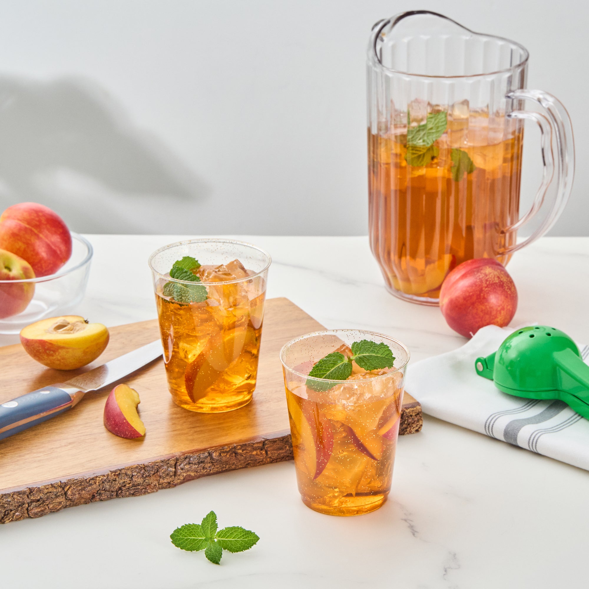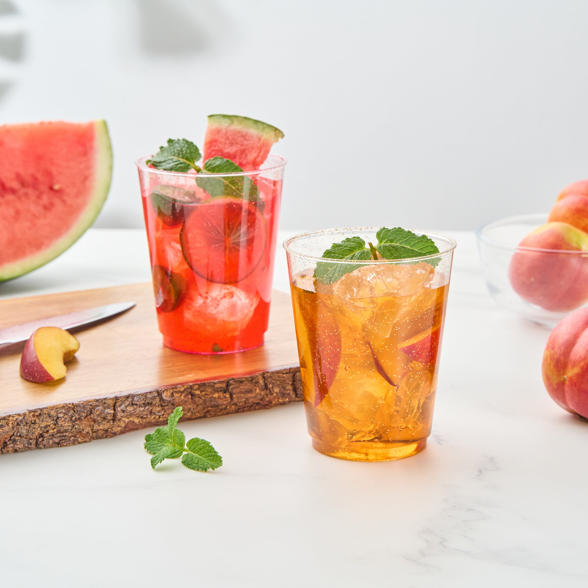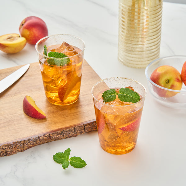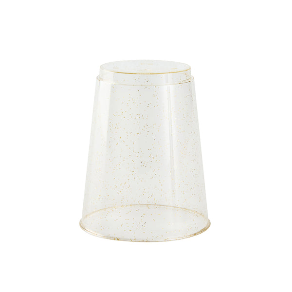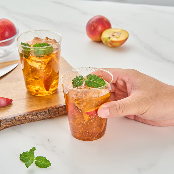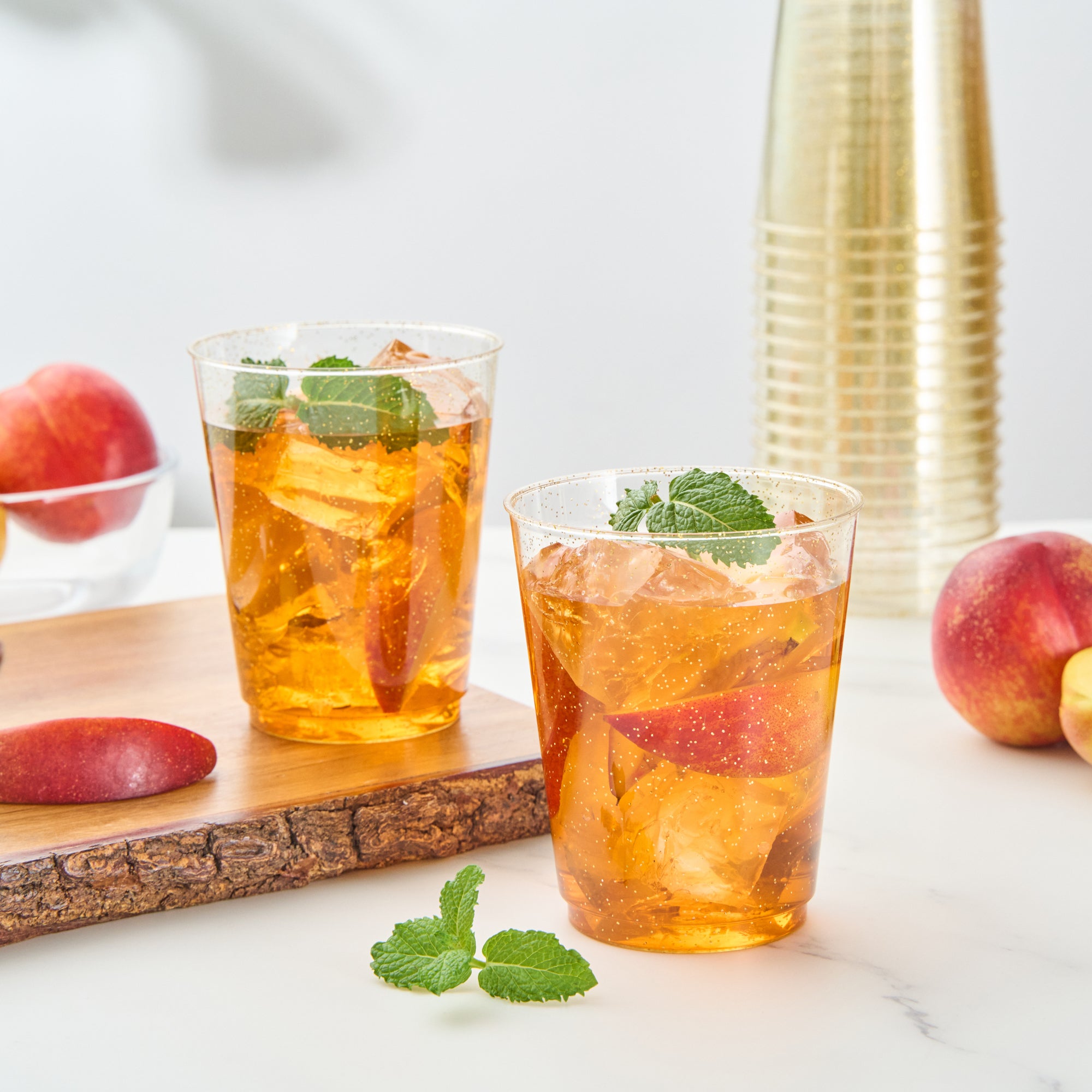 Elevate your event with our Chef 101 10-ounce Gold Glitter Plastic Tumblers. Made from sturdy PS plastic, these glitter finish cups feature an elegant gold finish that catches the light beautifully. These disposable glitter cups are durable, ensuring that beverages maintain their stunning appearance throughout the event. Each party cup has an ample 10 ounce capacity, perfect for serving cocktails, adding a touch of sparkly charm to any occasion. The dazzling glitter design of these cocktail cups contributes a festive vibe to weddings, parties, and family gatherings, making your refreshments doubly inviting. These plastic glasses are cold food-friendly, making them ideal for smoothies and chilled desserts. Being recyclable adds to the appeal of these disposable plastic glasses, blending convenience with eco-conscious values. Enrich your beverage service with these 10-ounce versatile cups that measure 2.95 inches in diameter and 3.8 inches in height. Sold in a 20 count box.