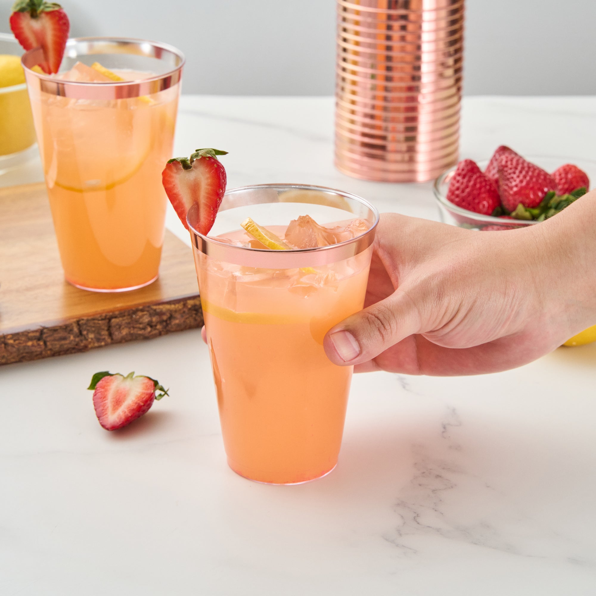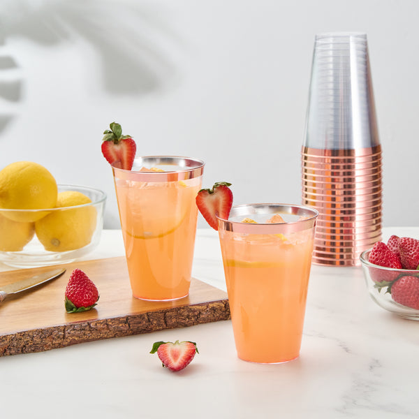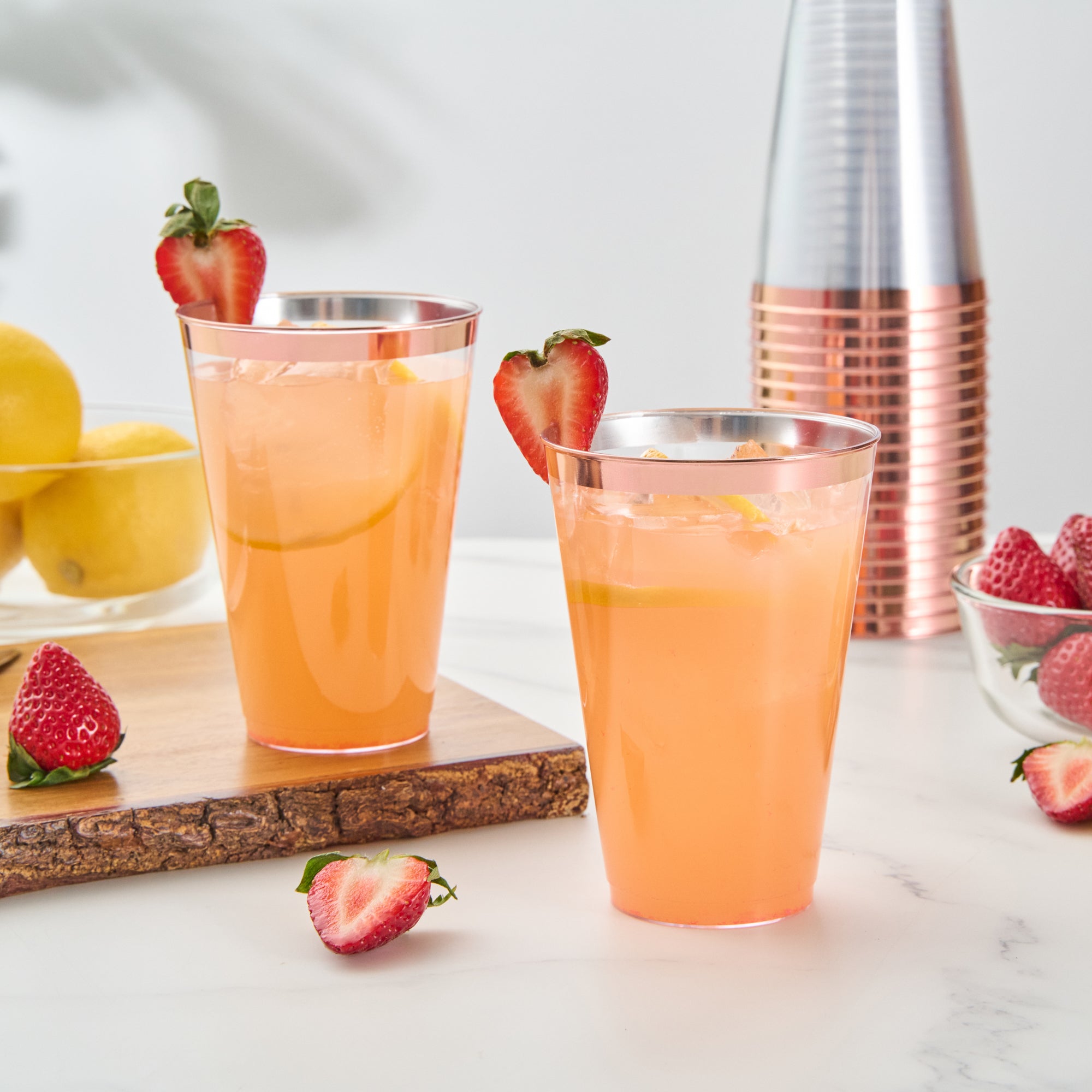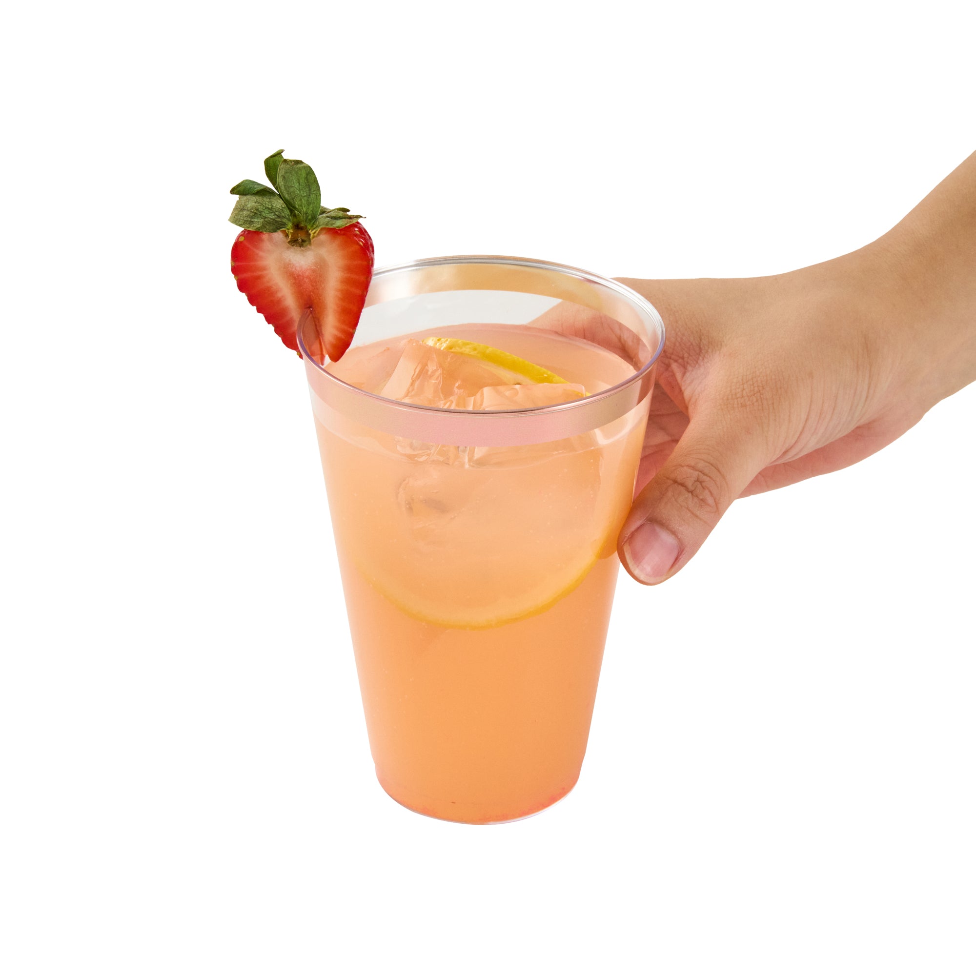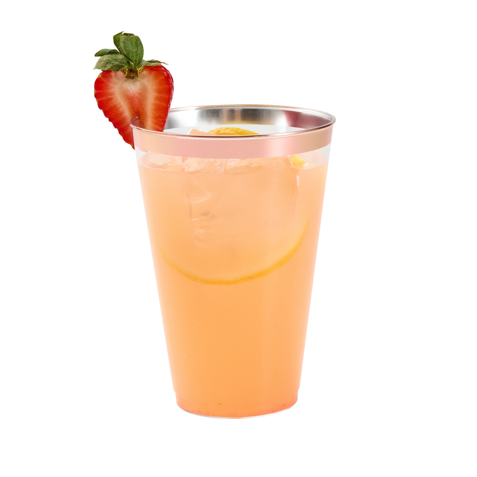 Elevate your event with our eye-catching Chef 101 14-ounce Clear Plastic Tumblers. These clear glasses combine style and practicality with their rose gold rims that elevate cocktail displays. Made from hard and durable PS plastic, these rose gold plastic cups add festive flair to any gathering, making them perfect for weddings, birthdays, and special celebrations. Cold food-friendly, these plastic cocktail glasses are ideal for serving chilled beverages at upscale events or casual picnics. Ideal for cocktails and mocktails, the 14 ounce capacity of these sturdy cups makes them a versatile choice for buffets and picnics. The recyclable and disposable features of these plastic tumblers offer the convenience of quick cleanup without compromising sustainability. Enhance your event decor with these attractive and functional 14-ounce cups that measure 3.3 inches in diameter and 4.8 inches in height. Sold in a 500 count box.