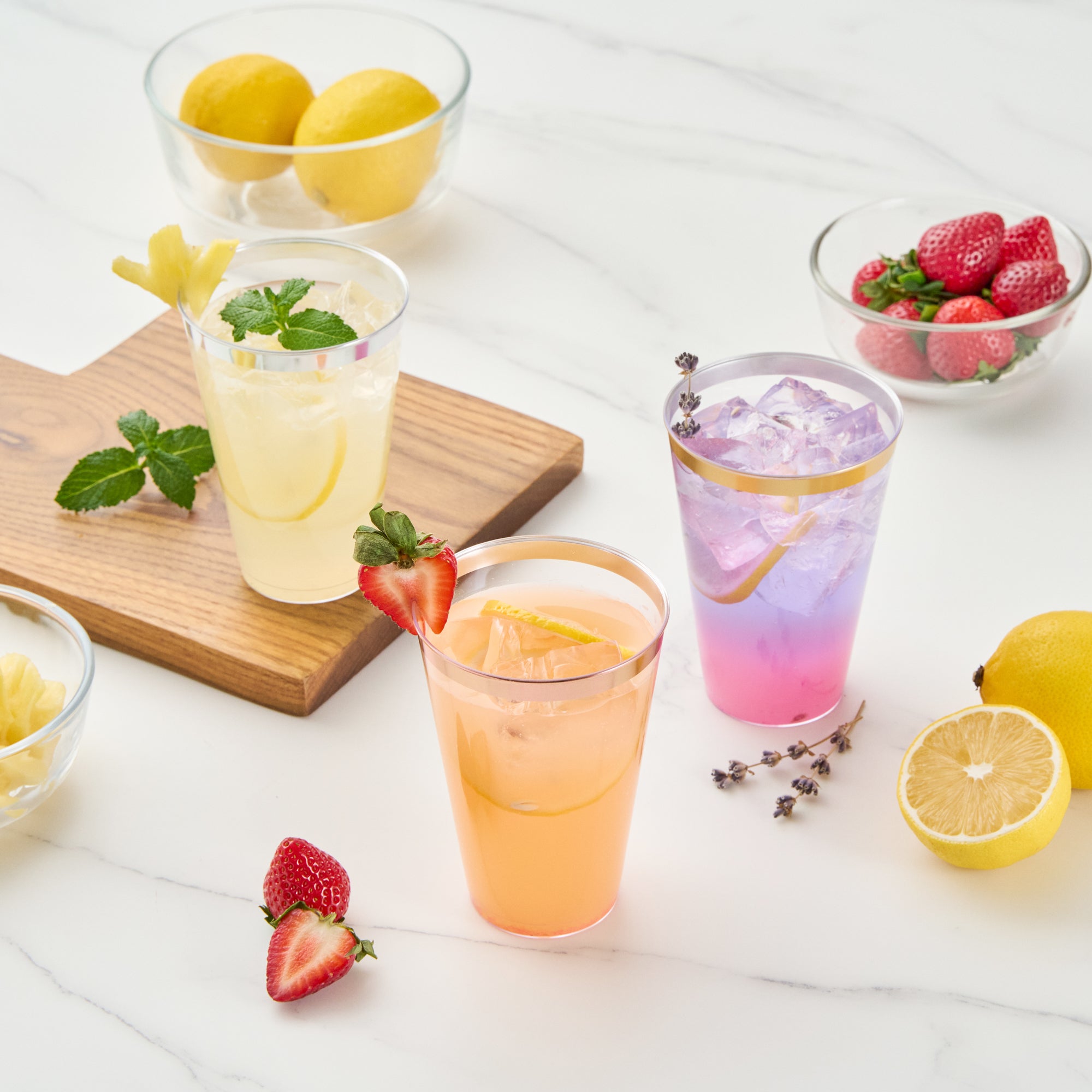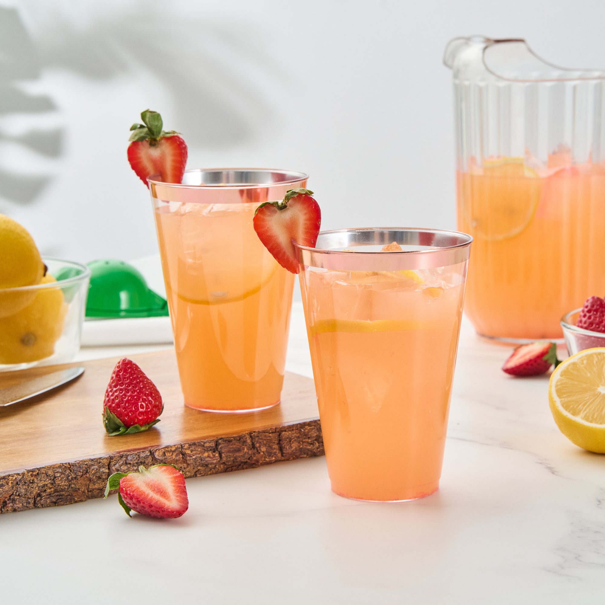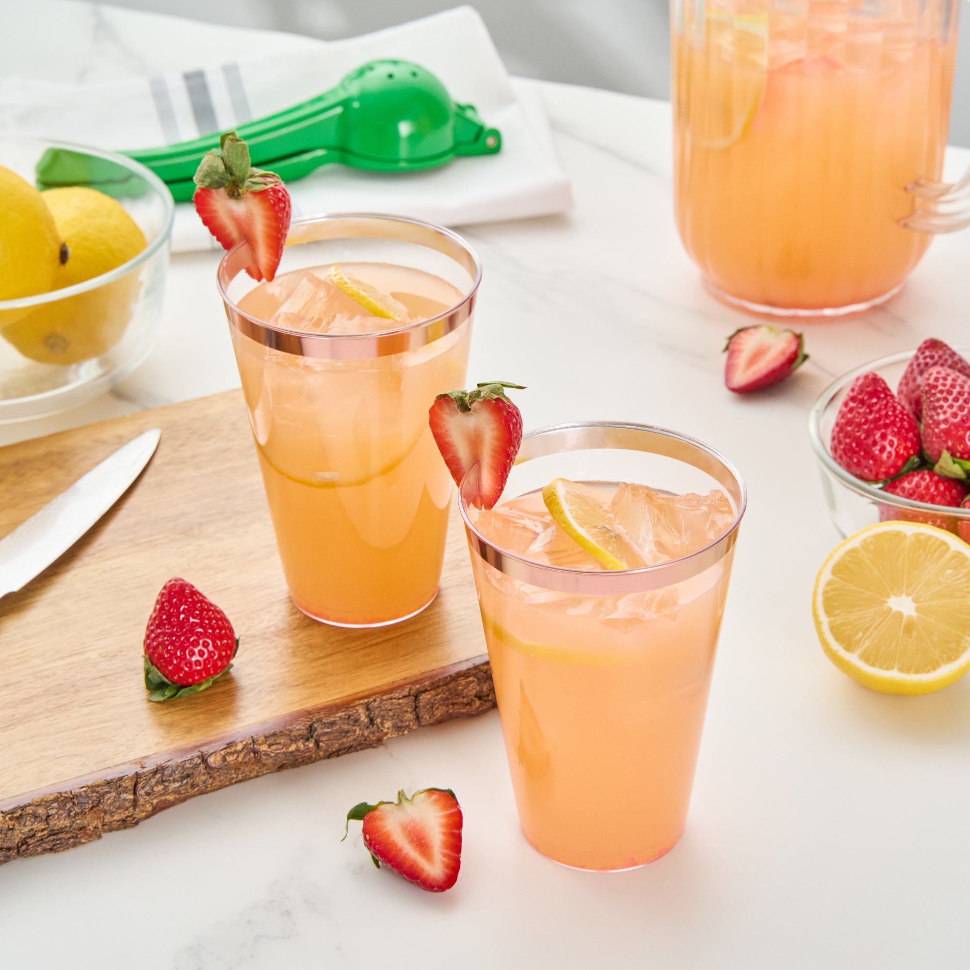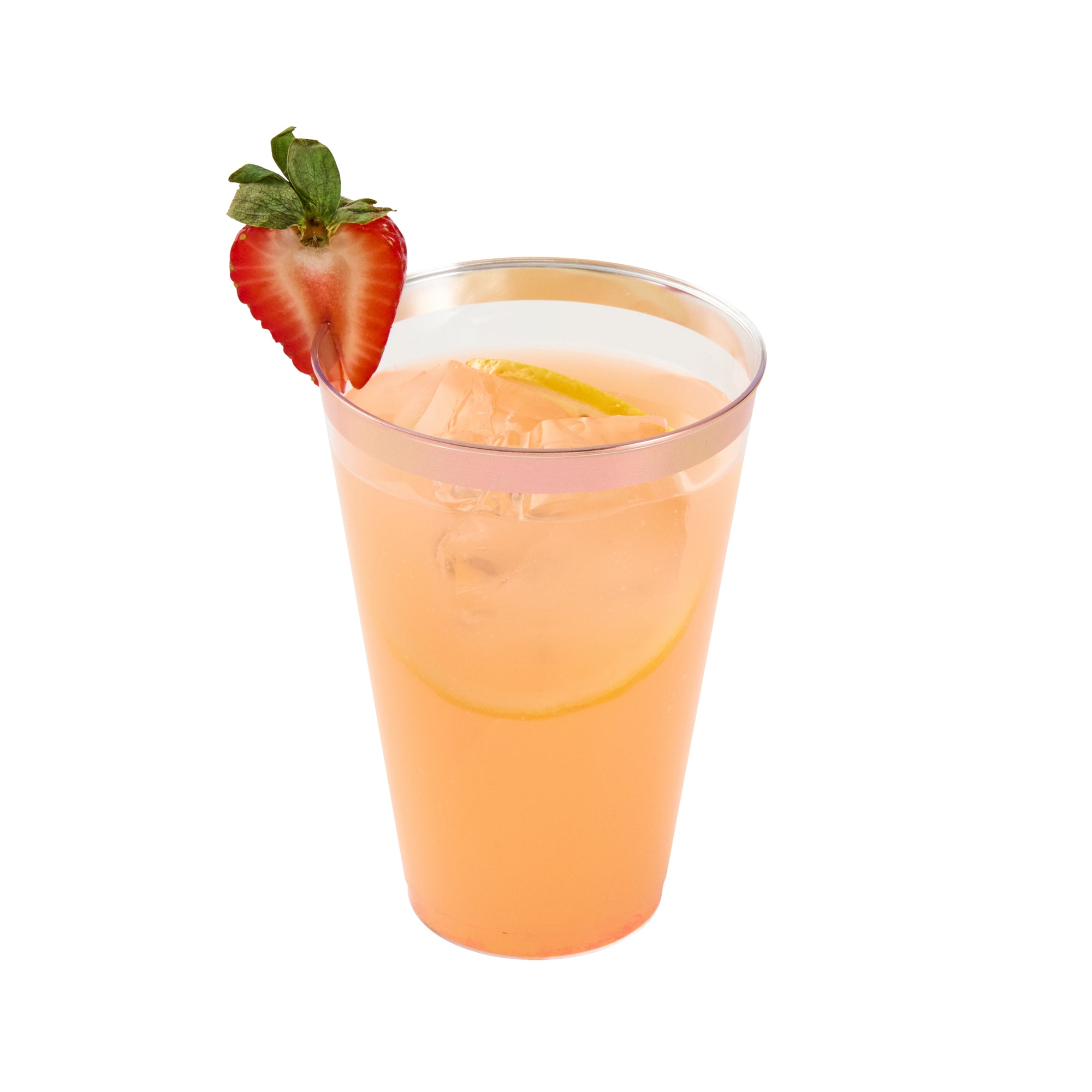 Elevate your event with our eye-catching Chef 101 14-ounce Clear Plastic Tumblers. These clear glasses combine style and practicality with their rose gold rims that elevate cocktail displays. Made from hard and durable PS plastic, these rose gold plastic cups add festive flair to any gathering, making them perfect for weddings, birthdays, and special celebrations. Cold food-friendly, these plastic cocktail glasses are ideal for serving chilled beverages at upscale events or casual picnics. Ideal for cocktails and mocktails, the 14 ounce capacity of these sturdy cups makes them a versatile choice for buffets and picnics. The recyclable and disposable features of these plastic tumblers offer the convenience of quick cleanup without compromising sustainability. Enhance your event decor with these attractive and functional 14-ounce cups that measure 3.3 inches in diameter and 4.8 inches in height. Sold in a 500 count box.