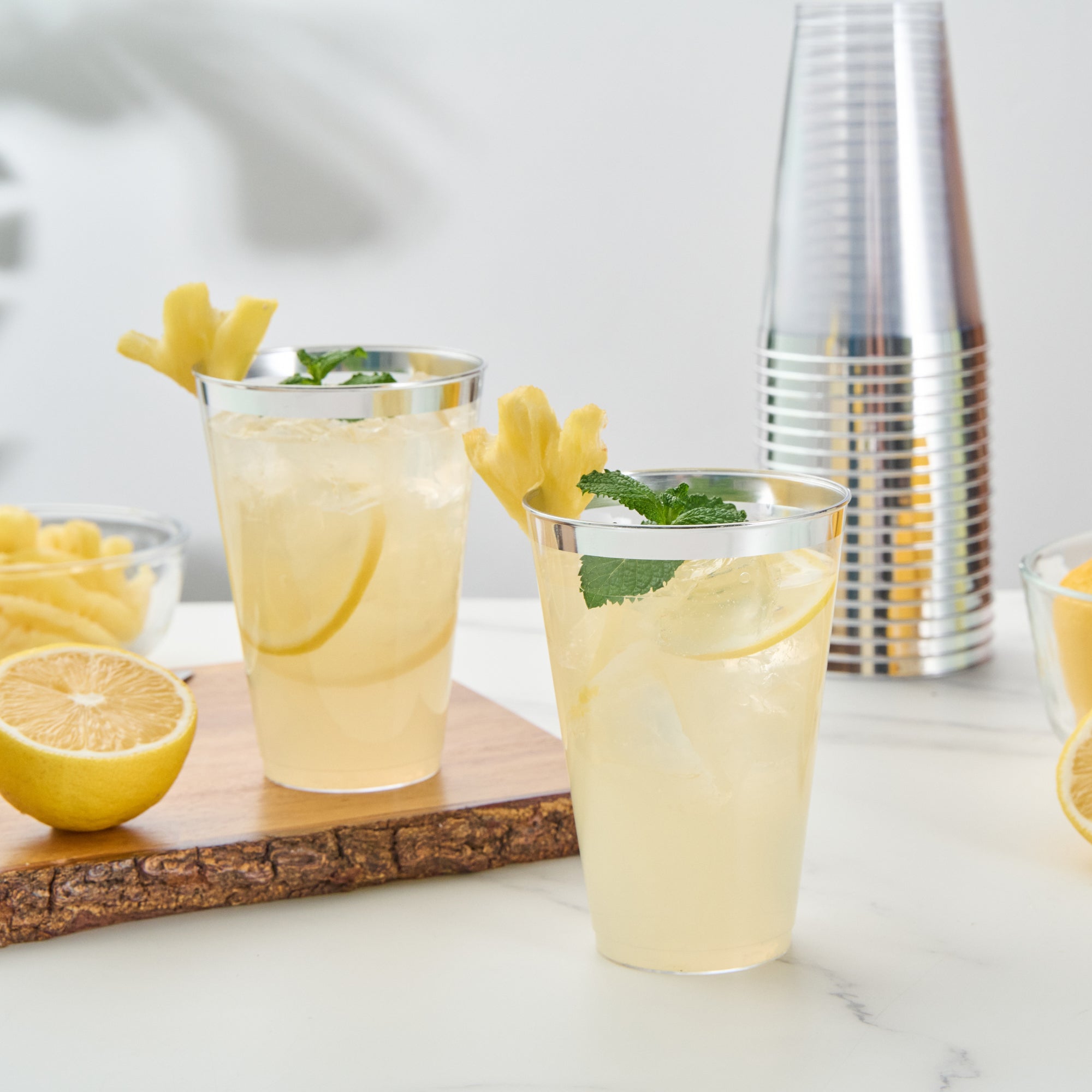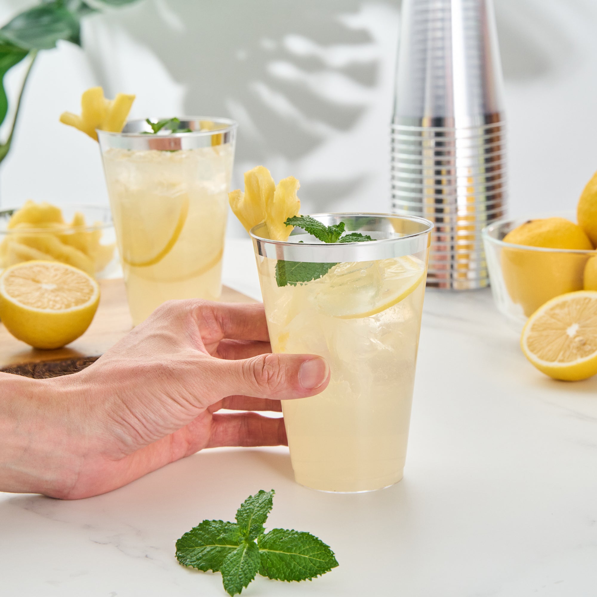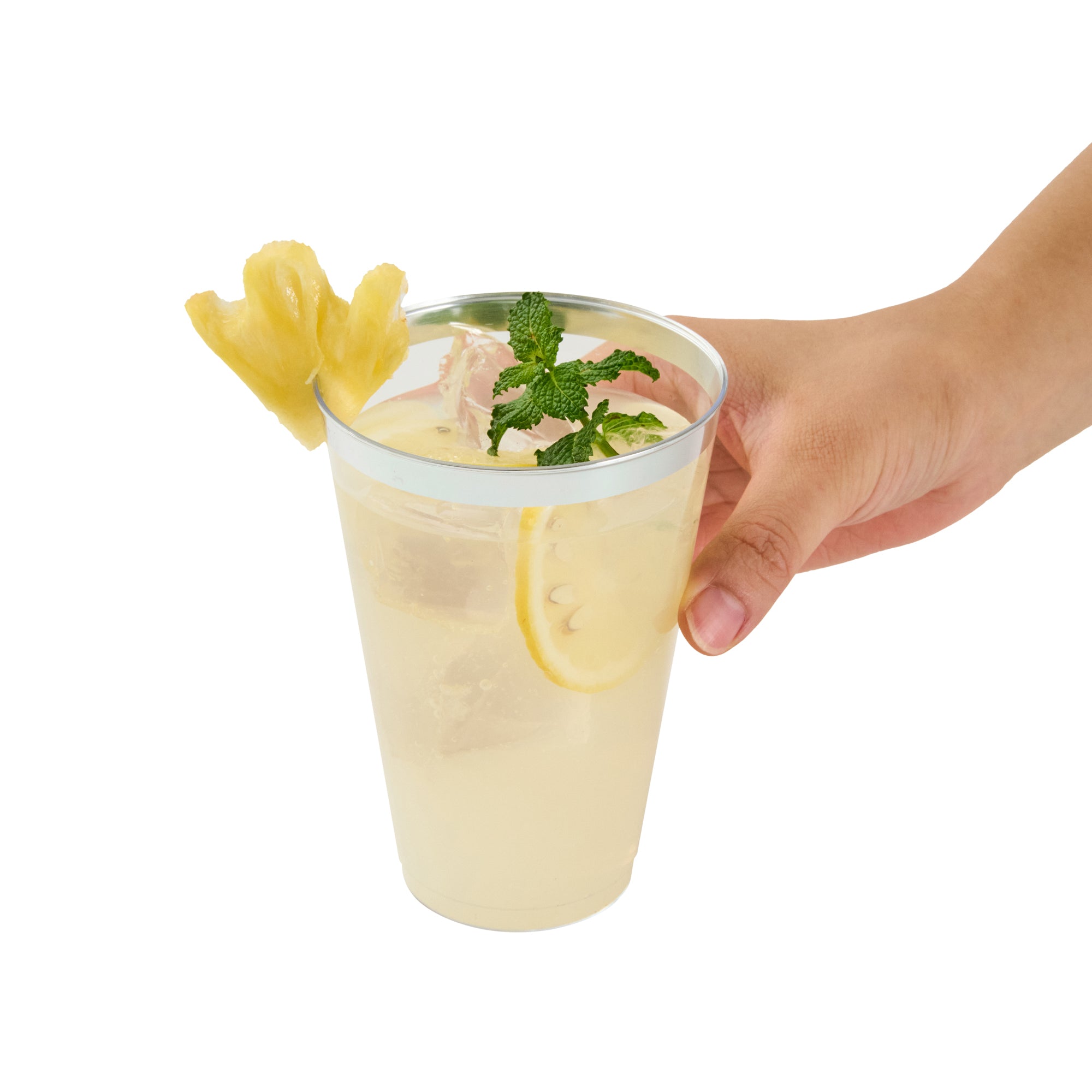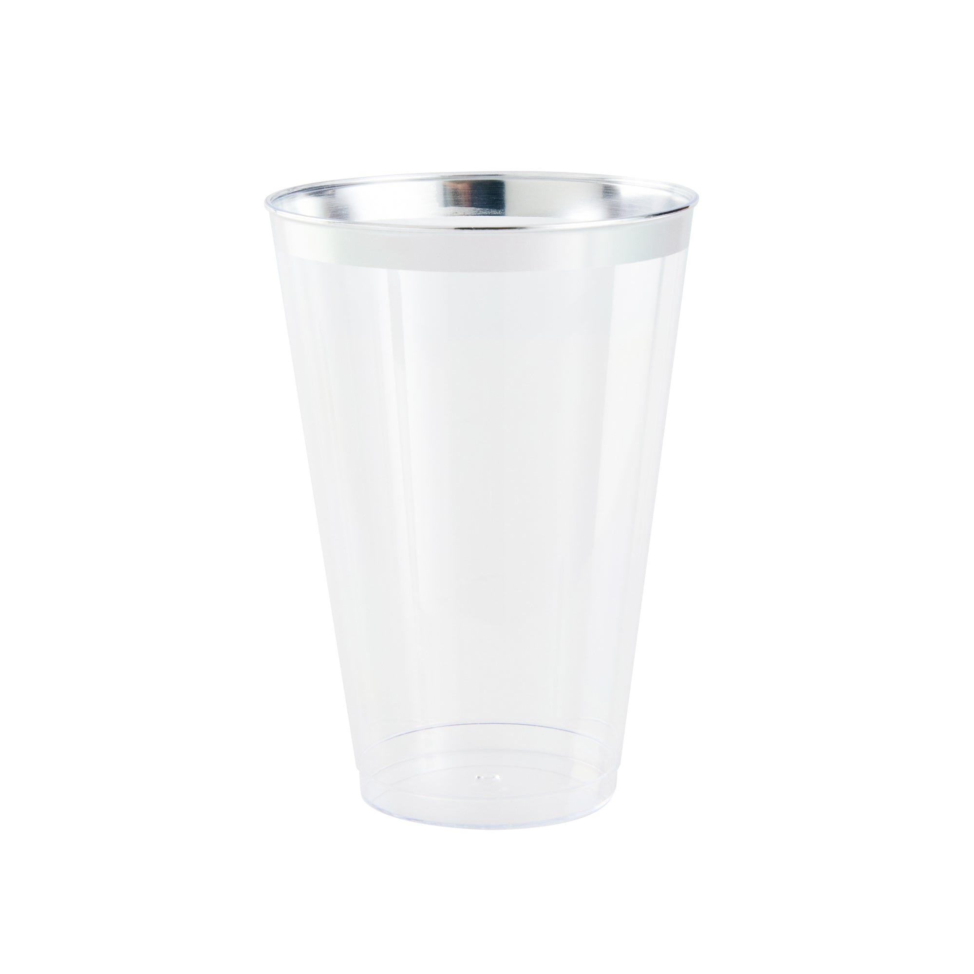 Impress guests effortlessly with our Chef 101 14-ounce Clear Plastic Tumblers. Featuring a dazzling silver rim design, these sturdy glasses effortlessly add sparkle to weddings, birthdays, or other refined celebrations while perfectly showcasing your signature drinks. These clear glasses are made of durable PS plastic that is disposable, ensuring exceptional convenience in busy settings. With a generous 14 ounce capacity, these plastic glasses are ideal for serving cocktails and punch, allowing guests to savor every sip. Designed to handle chilled beverages and desserts, these versatile glasses maintain their structure even with cold refreshments. Embrace sustainable practices with these recyclable glasses that blend sleek aesthetics with practicality. Elevate your party presentation with these 14-ounce silver rim glasses that measure 3.3 inches in diameter and 4.8 inches in height. Sold in a 500 count box.