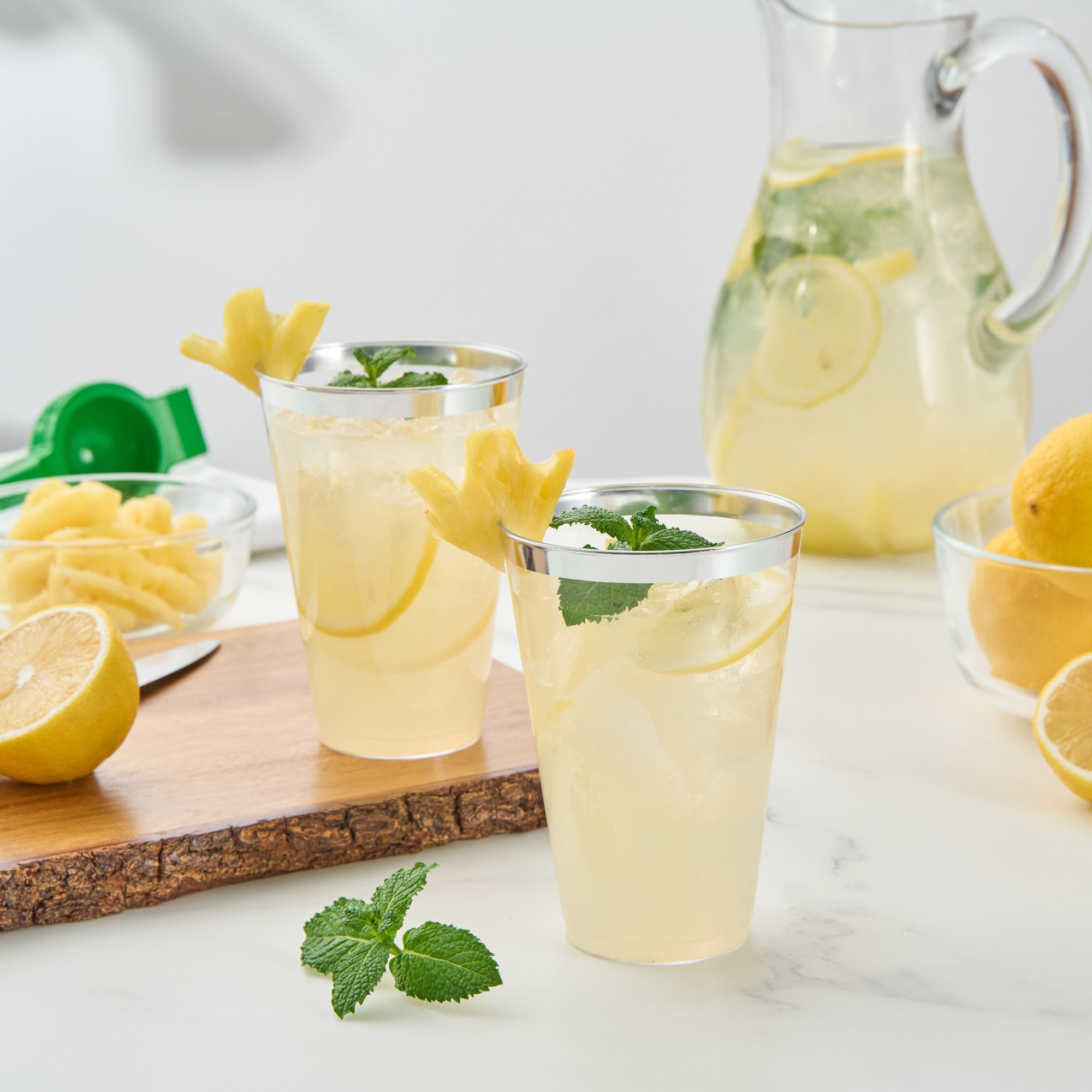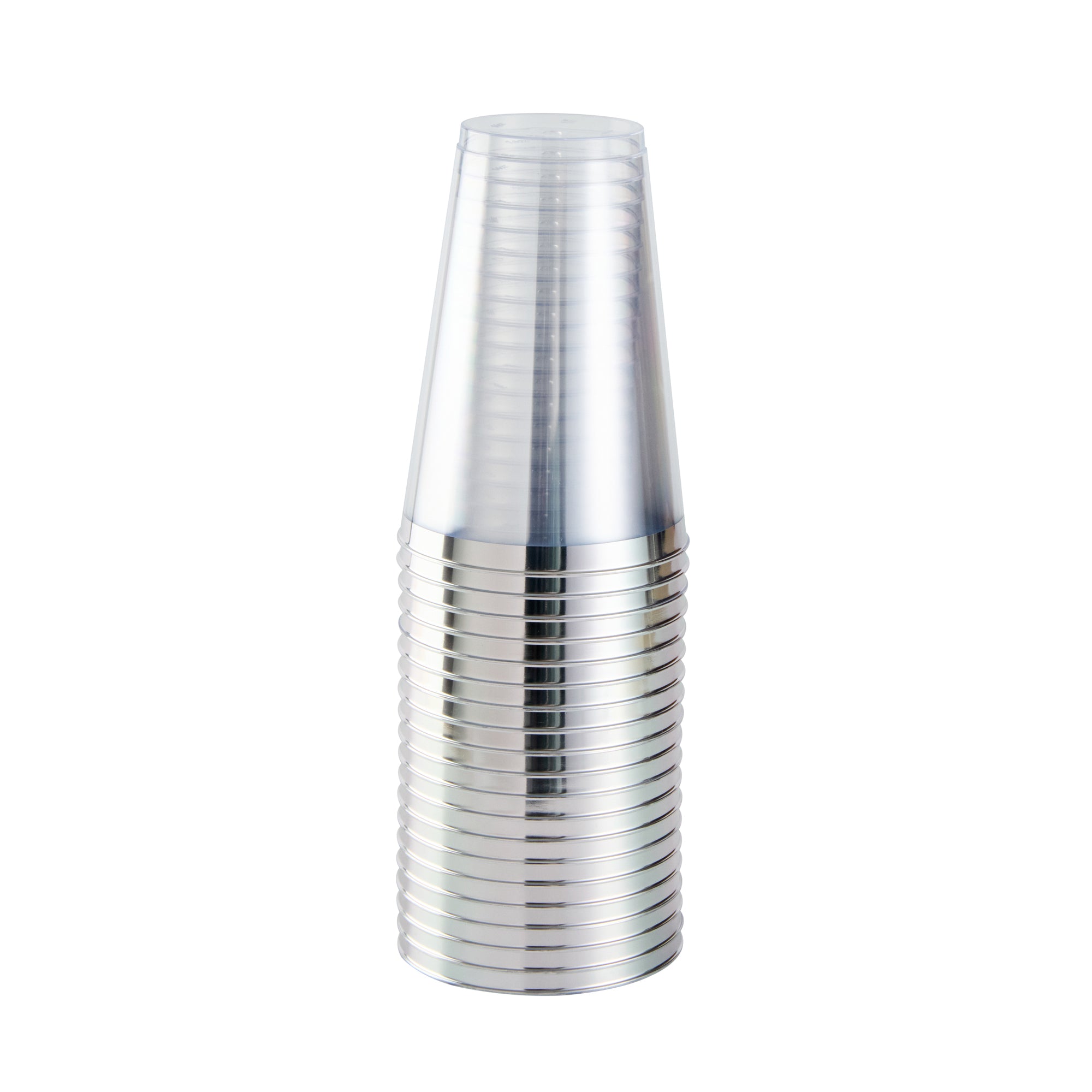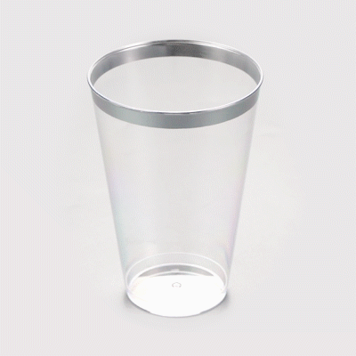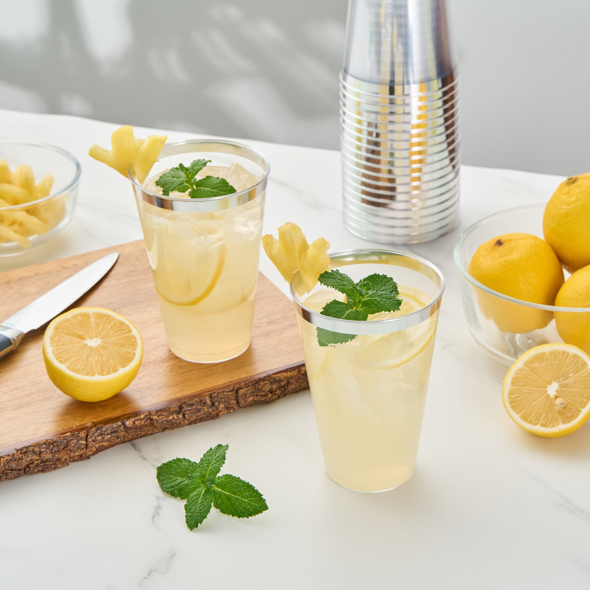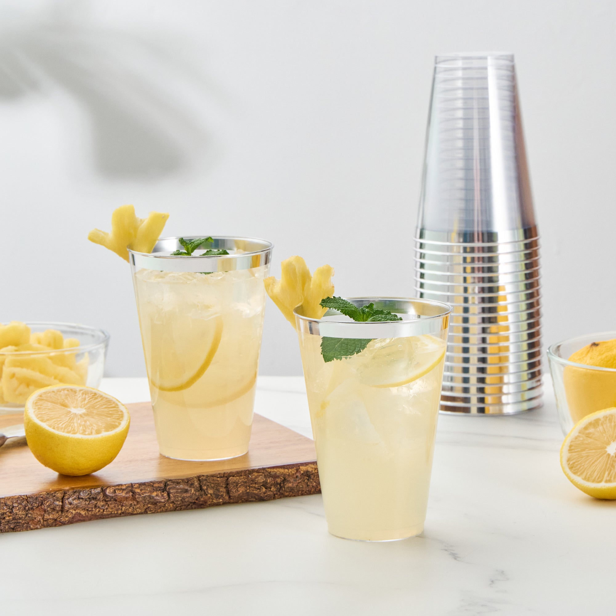 Impress guests effortlessly with our Chef 101 14-ounce Clear Plastic Tumblers. Featuring a dazzling silver rim design, these sturdy glasses effortlessly add sparkle to weddings, birthdays, or other refined celebrations while perfectly showcasing your signature drinks. These clear glasses are made of durable PS plastic that is disposable, ensuring exceptional convenience in busy settings. With a generous 14 ounce capacity, these plastic glasses are ideal for serving cocktails and punch, allowing guests to savor every sip. Designed to handle chilled beverages and desserts, these versatile glasses maintain their structure even with cold refreshments. Embrace sustainable practices with these recyclable glasses that blend sleek aesthetics with practicality. Elevate your party presentation with these 14-ounce silver rim glasses that measure 3.3 inches in diameter and 4.8 inches in height. Sold in a 500 count box.