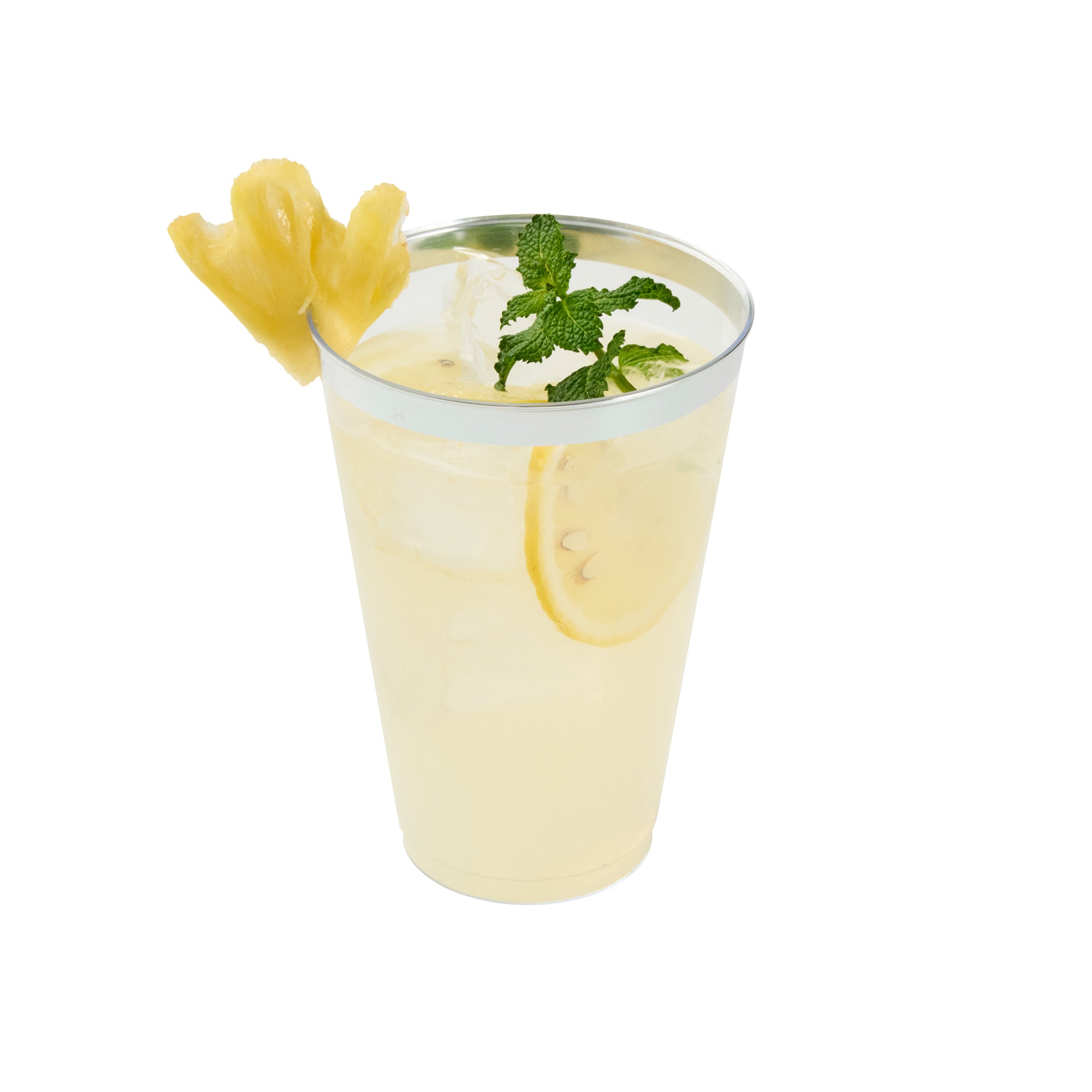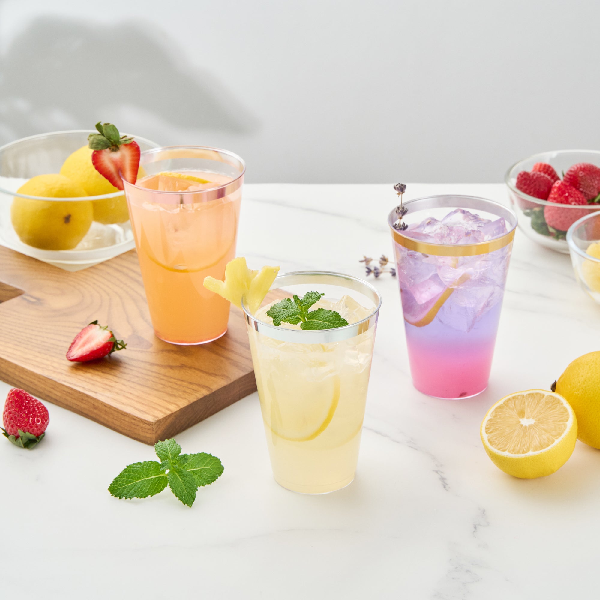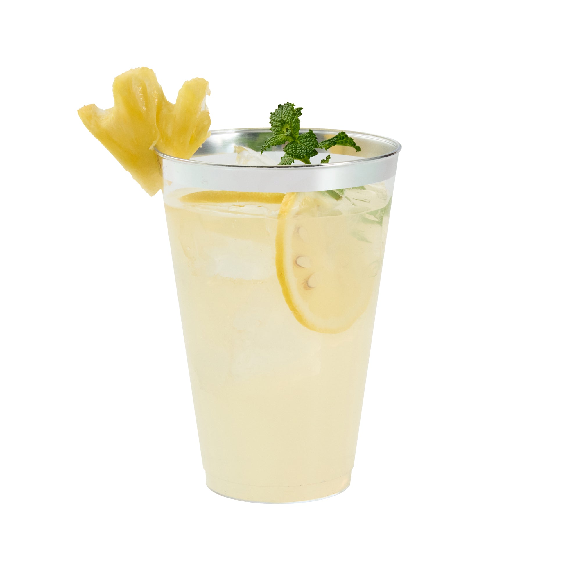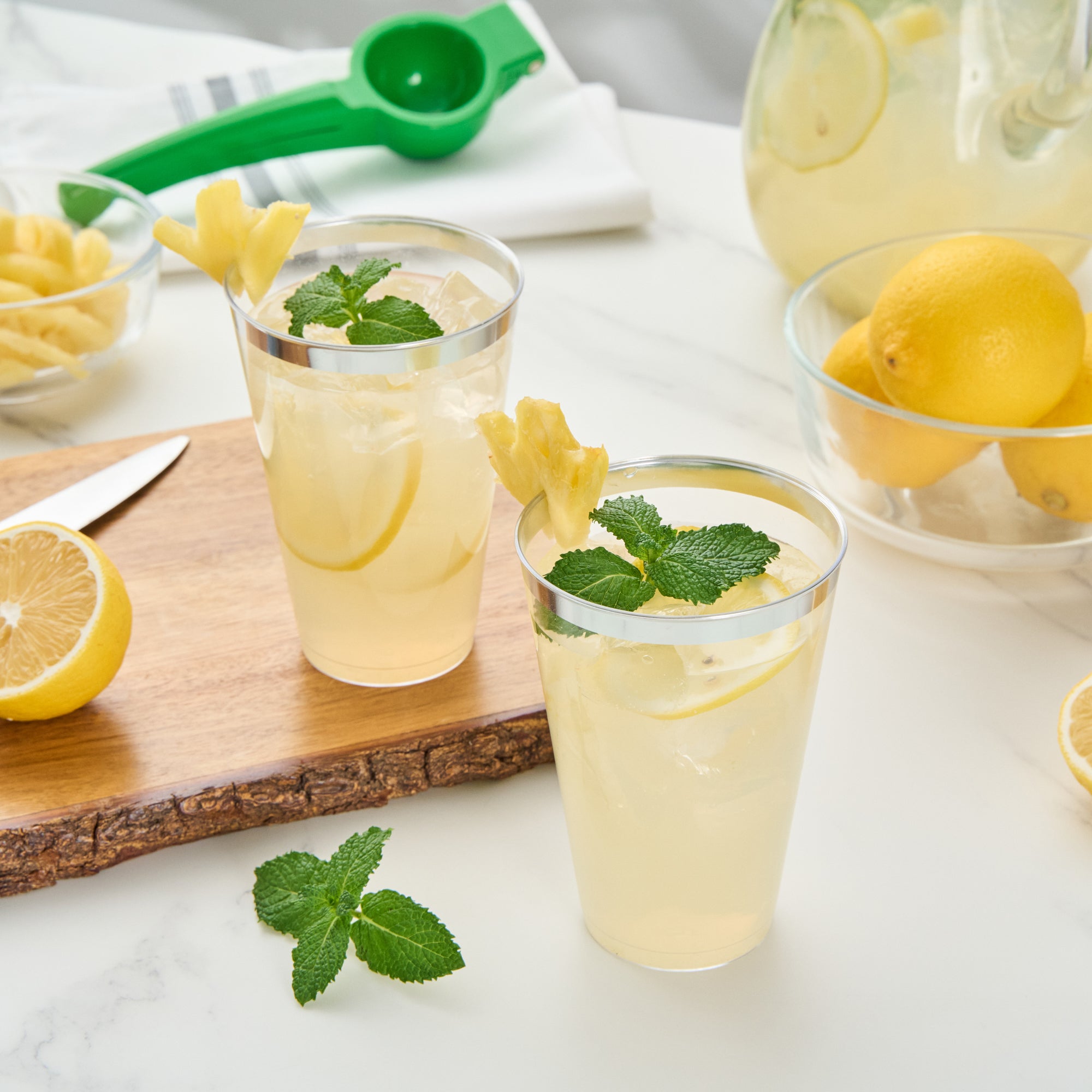 Impress guests effortlessly with our Chef 101 14-ounce Clear Plastic Tumblers. Featuring a dazzling silver rim design, these sturdy glasses effortlessly add sparkle to weddings, birthdays, or other refined celebrations while perfectly showcasing your signature drinks. These clear glasses are made of durable PS plastic that is disposable, ensuring exceptional convenience in busy settings. With a generous 14 ounce capacity, these plastic glasses are ideal for serving cocktails and punch, allowing guests to savor every sip. Designed to handle chilled beverages and desserts, these versatile glasses maintain their structure even with cold refreshments. Embrace sustainable practices with these recyclable glasses that blend sleek aesthetics with practicality. Elevate your party presentation with these 14-ounce silver rim glasses that measure 3.3 inches in diameter and 4.8 inches in height. Sold in a 500 count box.