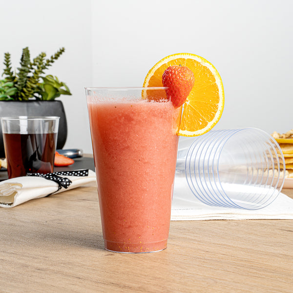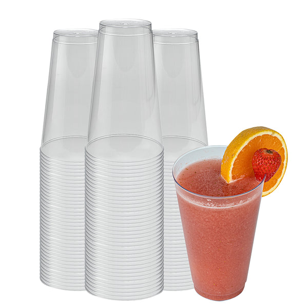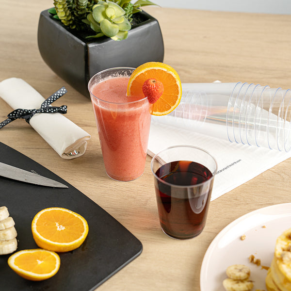 The durable PS plastic construction of these clear plastic disposable cups provides a sturdy drinking experience without any worry of breakage. Manufactured with rolled rims for additional strength.