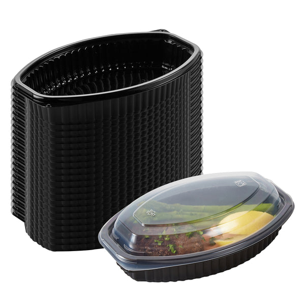 Elevate your foodservice presentation with our Chef 101 16-ounce Oval Black Plastic Food Containers. These plastic food containers come with a secure clear plastic lid and seal tightly to reduce spills during transportation. The flat design of these plastic lids allows for easy stacking and storing, maximizing space efficiency and ensuring secure transport. Designed for convenience, these take out containers are microwave-safe, letting customers reheat meals without needing additional utensils. Made from premium plastic, these to go containers can hold both hot and cold food items. These clear lids display the delicious contents inside, making them highly attractive to customers. The sleek black finish of these carry out containers adds a touch of sophistication to your takeaway meals, enhancing presentation. To store leftovers, these disposable food containers are freezer-safe and allow you to refrigerate your food for later use. Ideal for eco-conscious foodservice establishments, these takeaway containers are recyclable and help minimize your carbon footprint. These plastic containers with lids are disposable and can be thrown away after use, making cleanup easy. These food containers with lids measure 8 inches in length by 5.5 inches in width by 2.25 inches in height and have a capacity of 16 ounces. Sold in a 50 count box.