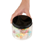16 OZ CLEAR PLASTIC CANDY AND SNACK JAR - WITH BLACK ALUMINUM LID