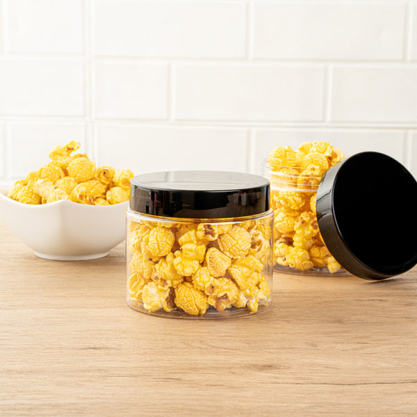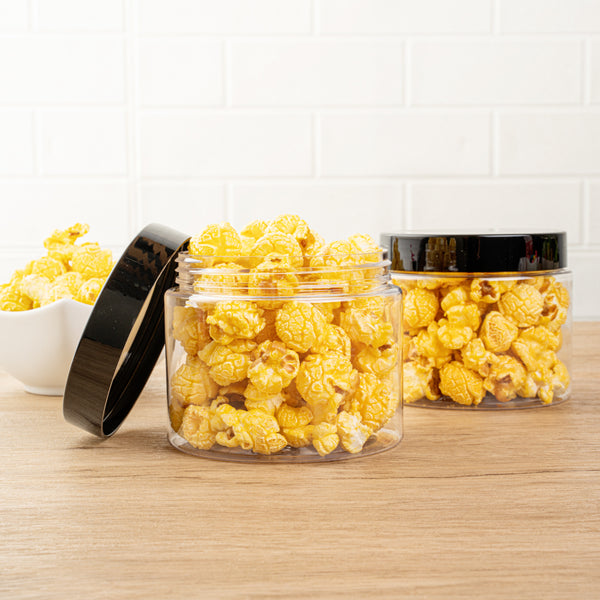 16 OZ ROUND CLEAR PLASTIC CANDY AND SNACK JAR - WITH BLACK PLASTIC LID