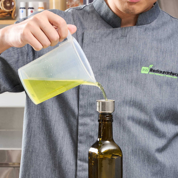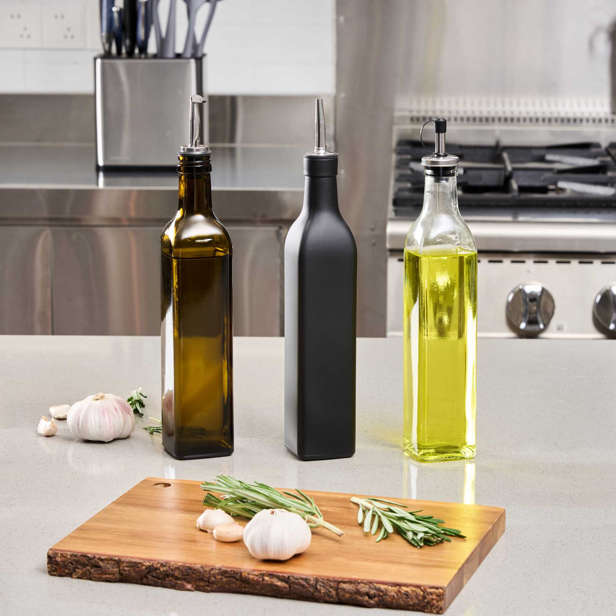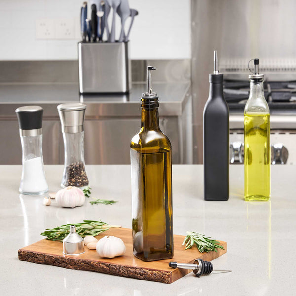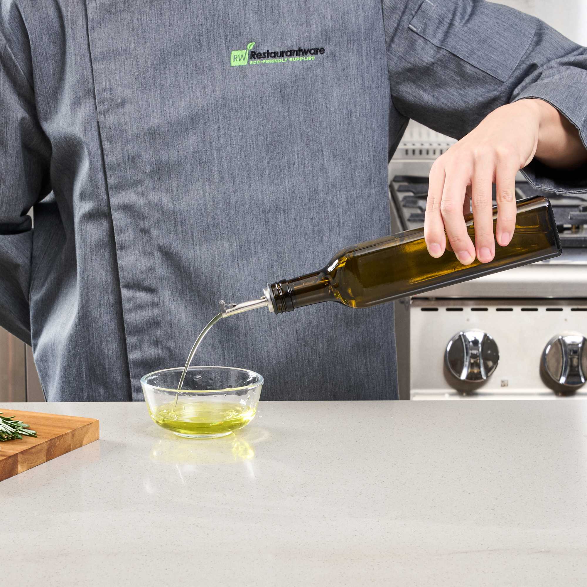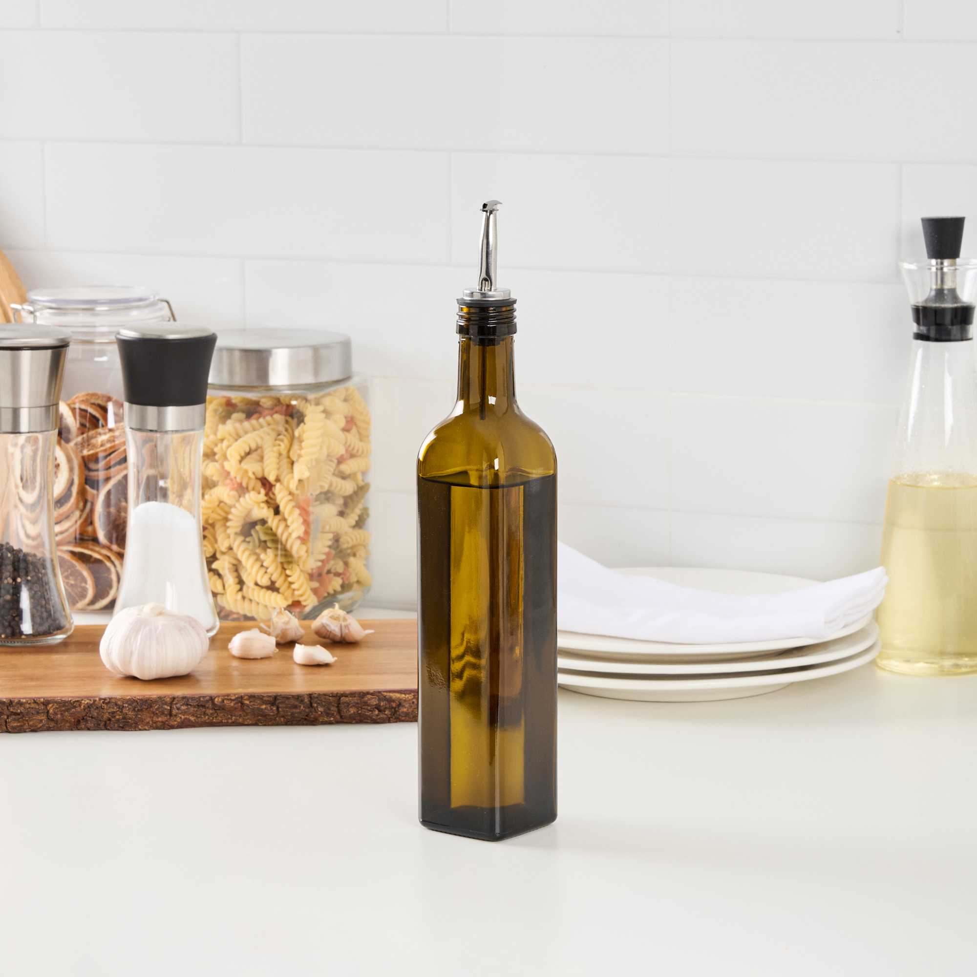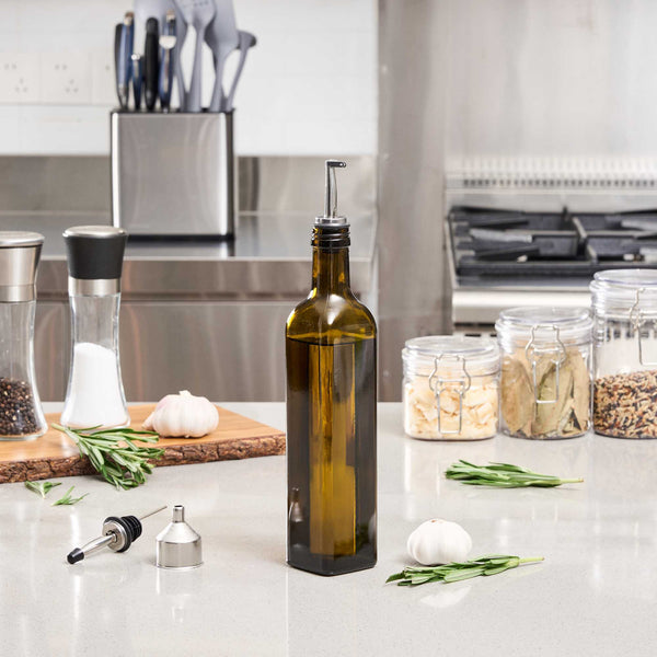 Enhance your tabletop service with our Chef 101 16.9-Ounce Amber Glass Olive Oil Dispenser. Designed with a beautiful amber finish, this olive oil dispenser protects your oil from light to maintain its potency. The stainless steel pourer of this olive oil dispenser bottle provides a controlled flow of the contents inside to avoid over-pouring. Plus, it includes a funnel kit for smooth pouring. This oil and vinegar bottle holds up to 16.9 ounces and measures 12.2 inches tall by 3.2 inches wide. Sold in a 1 count box.