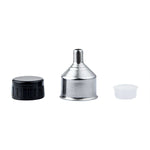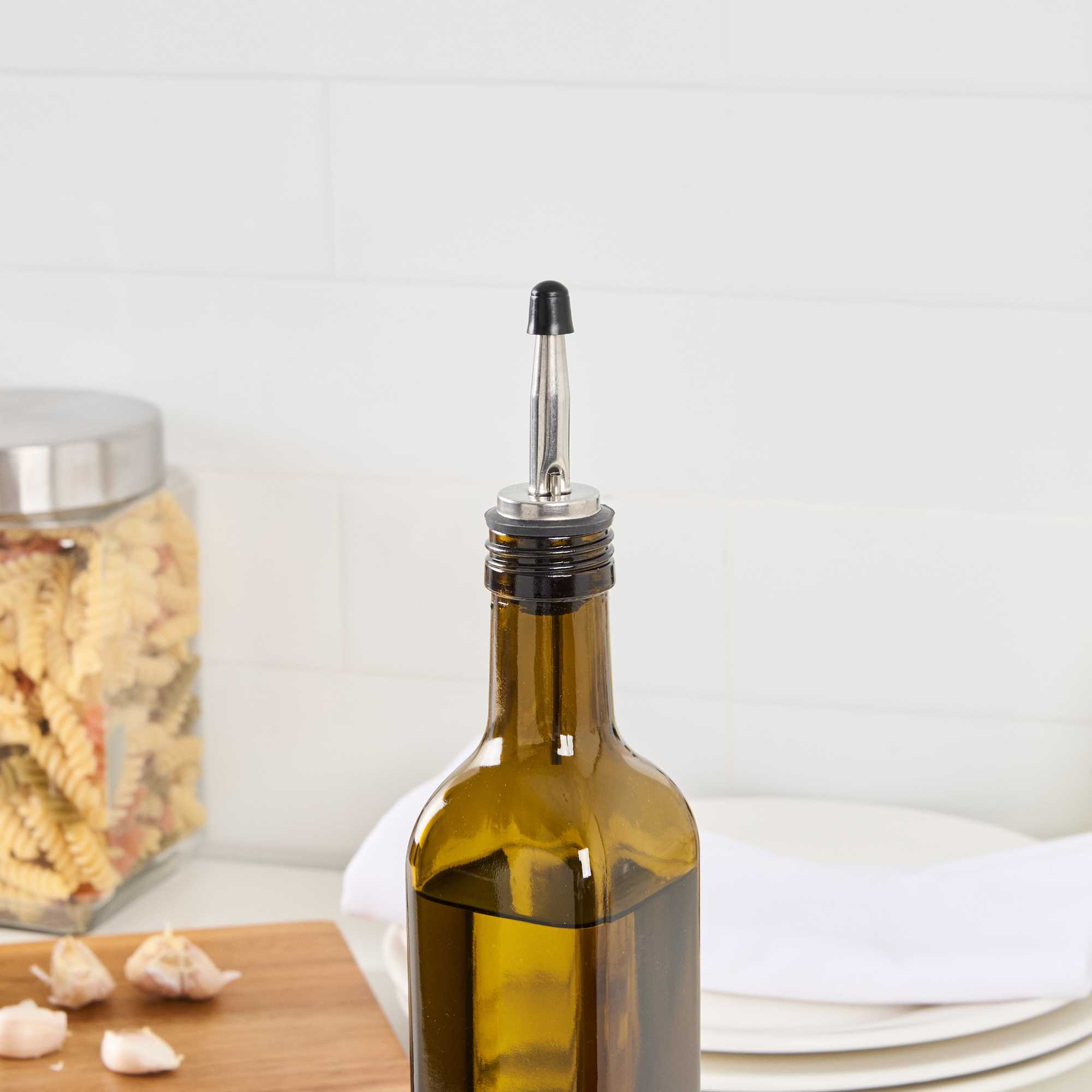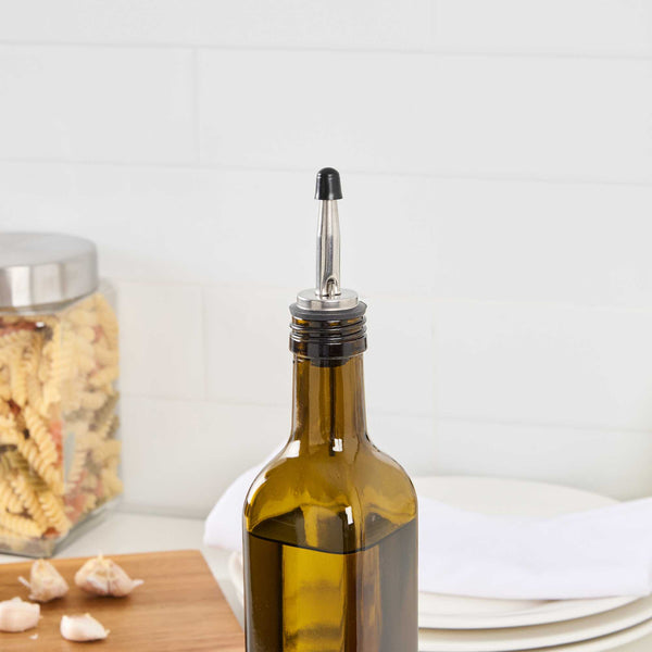 - Stainless steel pourer for a controlled pouring of oil and avoids excess dripping
