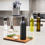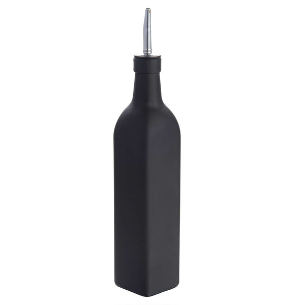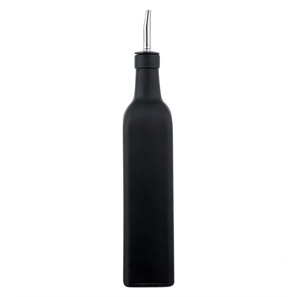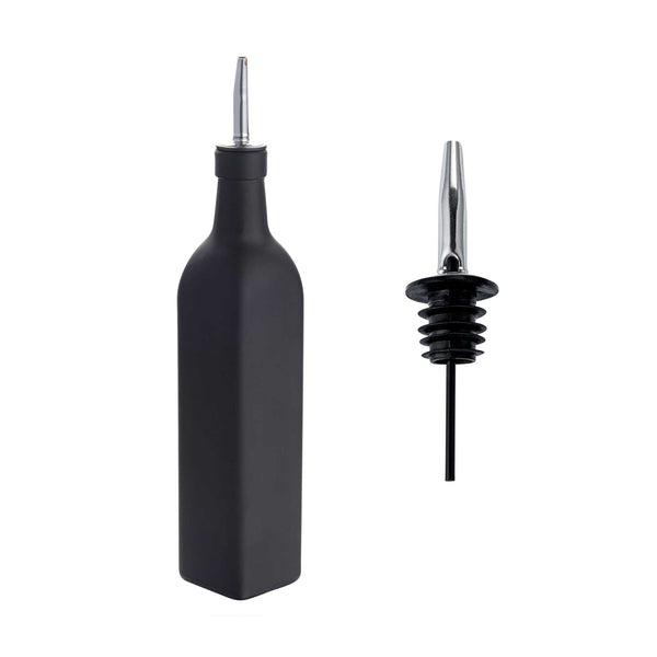 Drizzle vinegar on salads with our Chef 101 16.9-ounce Black Glass Olive Oil Dispenser. Featuring a matte black finish, this oil and vinegar bottle adds a touch of elegance to your already stylish tablescapes and makes it difficult for light to reach into the bottle and ruin the oil's potency. With a stainless steel pourer, this oil dispenser bottle won't leak liquids while pouring to avoid making a mess. Plus, it includes a funnel kit for smooth pouring. This cooking oil dispenser holds up to 16.9 ounces of vinegar or dressing. Measuring 12.4 inches tall by 2.4 inches wide, this oil bottle is the perfect size for placing on your restaurant's dining tables. Sold in a 1 count box.