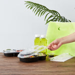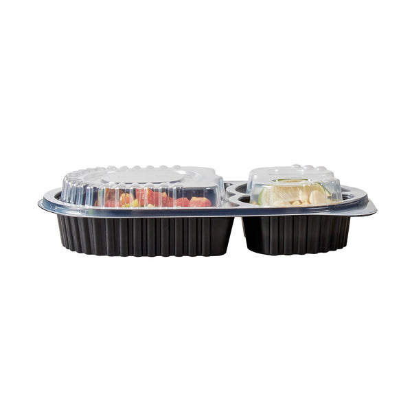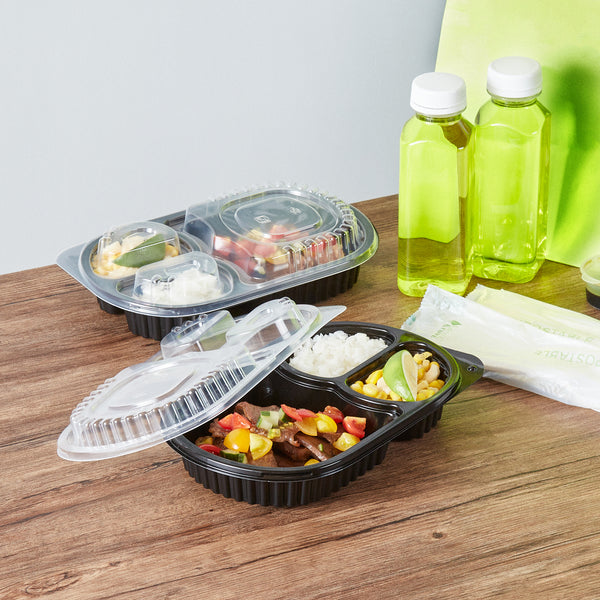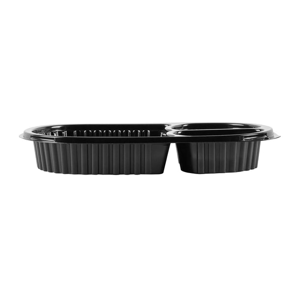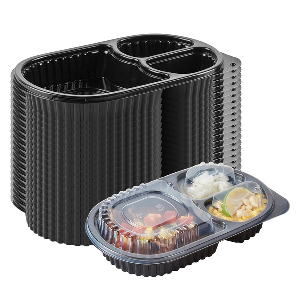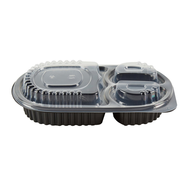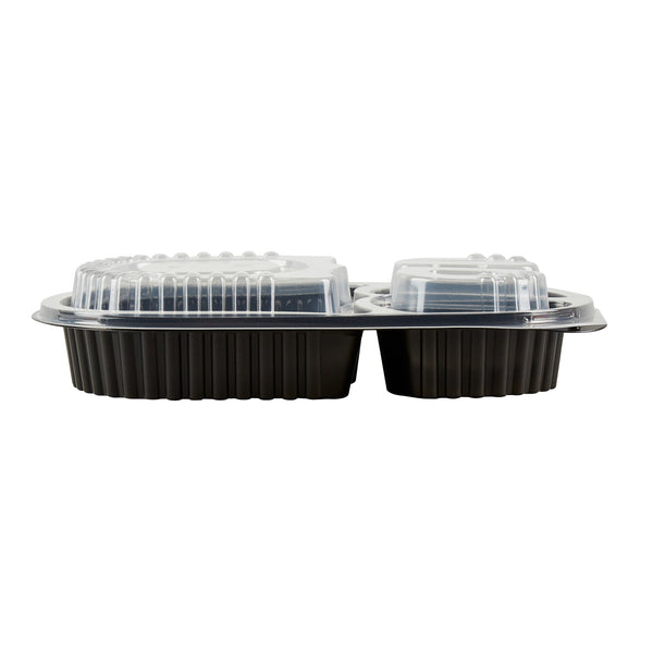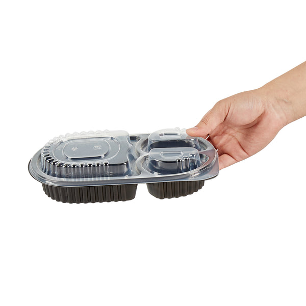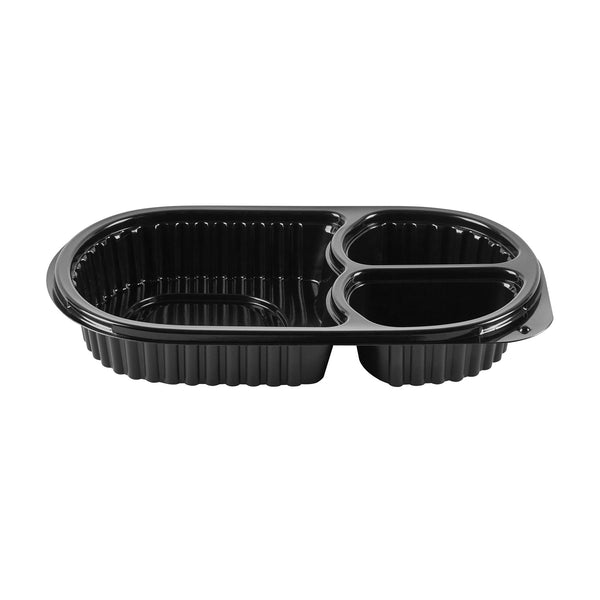 Elevate your meal presentations with our Chef 101 19-ounce Oval Black Plastic 3 Compartment Food Containers. These to go containers feature 3 compartments, allowing you to pack different foods separately and preserve their individual flavors and textures. The included lid of these take out containers forms a secure seal and prevents spills in transit, ensuring your dishes arrive intact. Designed to be microwave-safe, these plastic containers with lids allow customers to reheat meals without changing utensils, adding to their convenience. Crafted from durable plastic, these to go boxes are suitable for holding hot and cold food items. The clear lids of these plastic food containers ensure optimal visibility of their content and facilitate easy identification. These carry out containers have a sleek black finish and add a touch of sophistication to your takeaway meals. Suitable for leftover storage, these food containers with lids are freezer-safe. For eco-minded foodservice establishments, these takeaway containers are recyclable and help minimize your carbon footprint. To ensure an easy cleanup, these disposable food containers can be discarded after use. Measuring 9.25 inches in length by 6 inches in width by 2.25 inches in height, these take out boxes have a capacity of 19 ounces and provide ample space for a variety of dishes. Sold in a 100 count box.