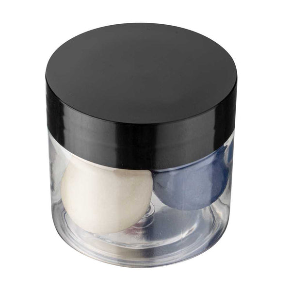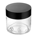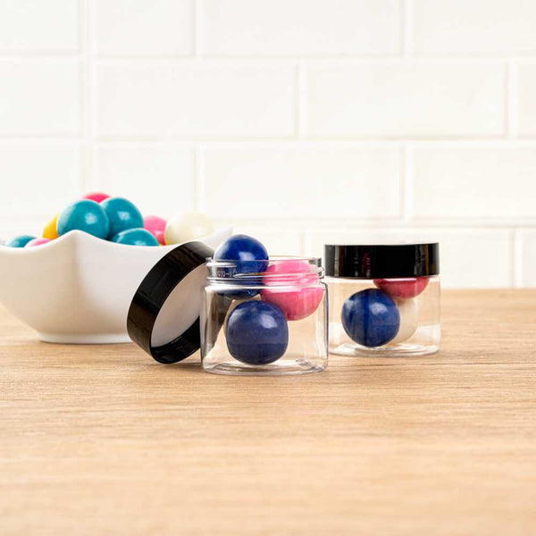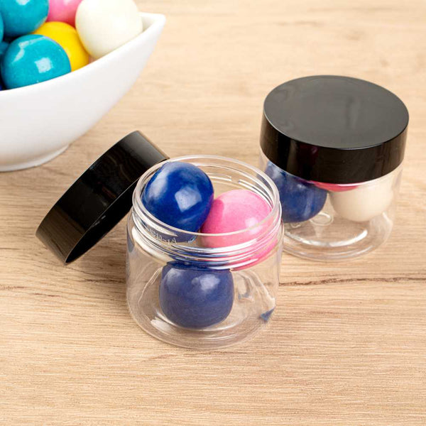 2 OZ ROUND CLEAR PLASTIC CANDY AND SNACK JAR - WITH BLACK PLASTIC LID