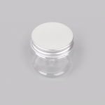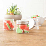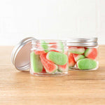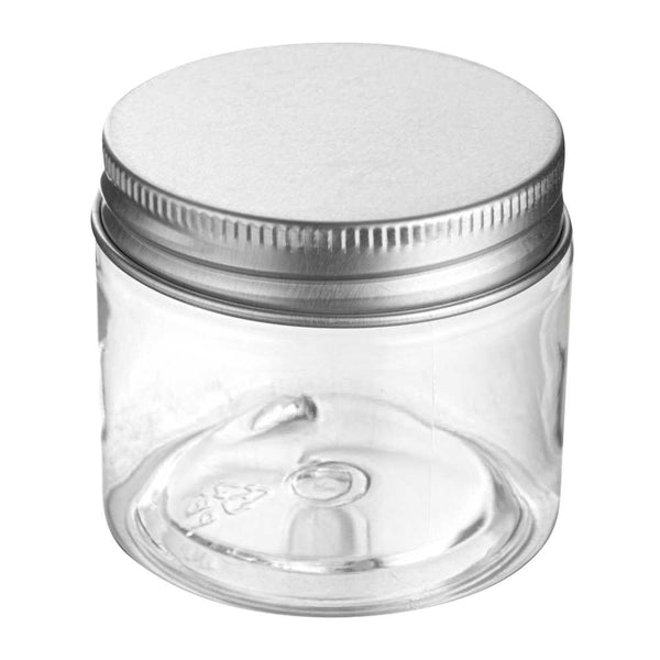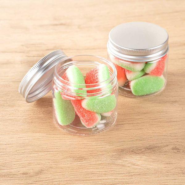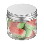 2 OZ CLEAR PLASTIC CANDY AND SNACK JAR - WITH SILVER ALUMINUM LID